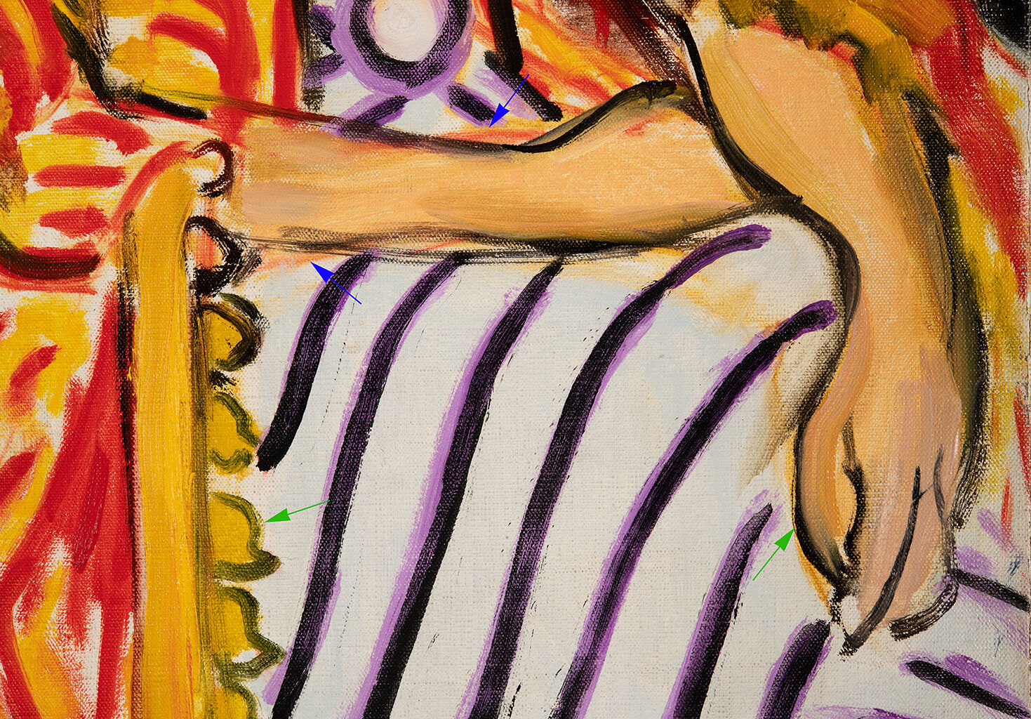 Fig. 12. Detail photograph of sketched red and yellow lines for the forearm (indicated by blue arrows) and wet-over-wet outlines in the outer Persian robe (indicated by green arrows), Seated Young Woman with an Amber Necklace (1942)