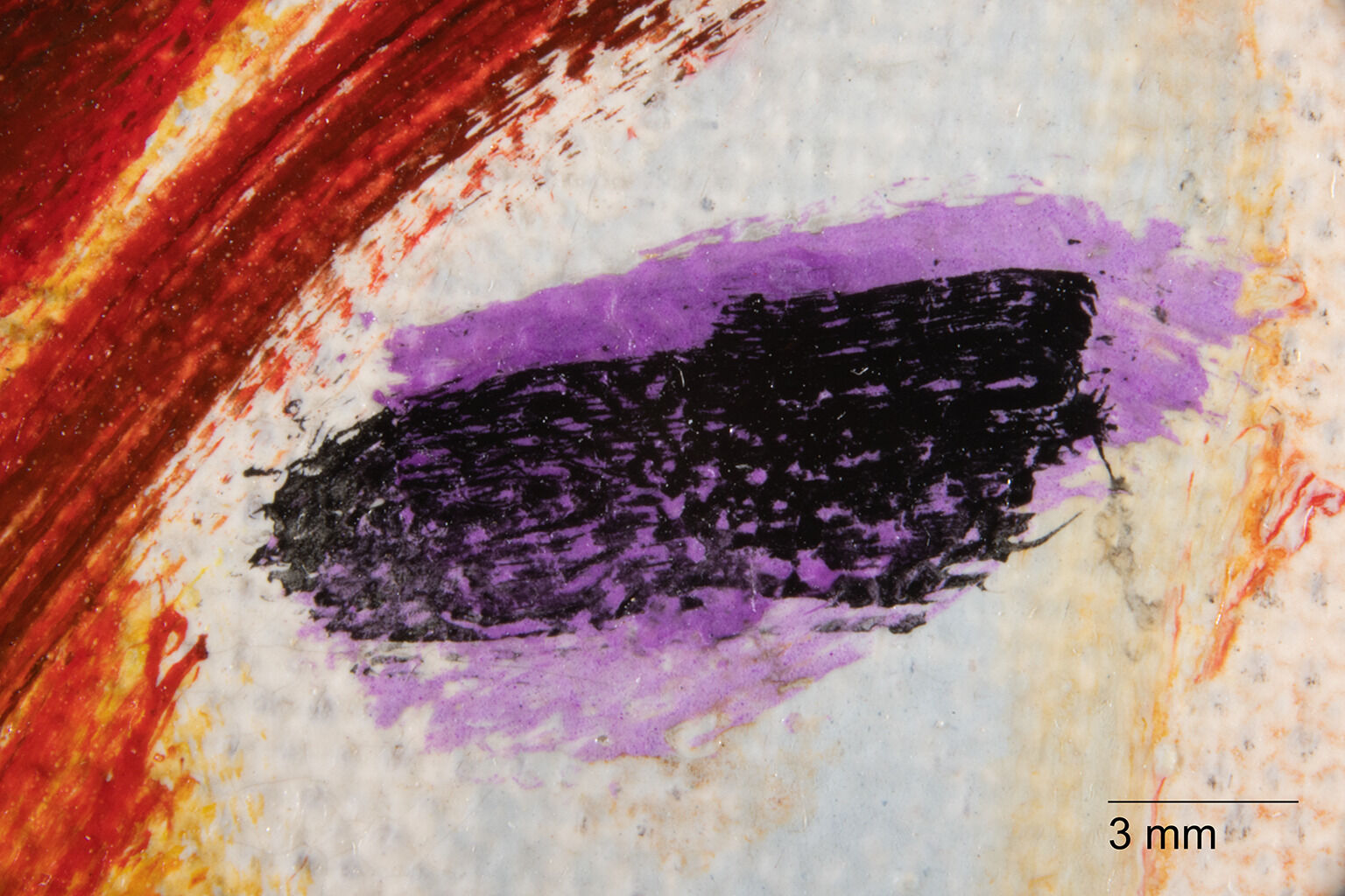 Working quickly, Matisse appears to have then alternated between painting the chair and the figure, making it difficult to determine the precise order of paint application. While the majority of the composition consists of wet-over-wetwet-over-wet: An oil painting technique which involves drawing a stroke of one color across the wet paint of another color. brushwork, there are also examples of wet-over-drywet-over-dry: An oil painting technique that involves layering paint over an already dried layer, resulting in no intermixing of paint or disruption to the lower paint strokes.. The purple stripes of the inner gown were applied after the lower pale gray-blue color of the gown had dried. Similarly, the black stripes here were applied over the already dried purple stripes (Fig. 13). This differs from many of the other black outlines, such as the those around the arms and outer Persian robe in Figure 12, which were incorporated into the composition when the surrounding or underlying paint was still wet.