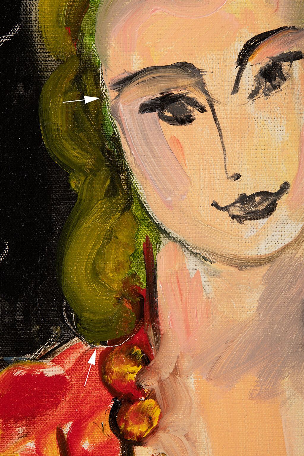 Fig. 17. Detail photograph of sgraffito lines around the figure’s face and hair (indicated by white arrows), Seated Young Woman with an Amber Necklace (1942)