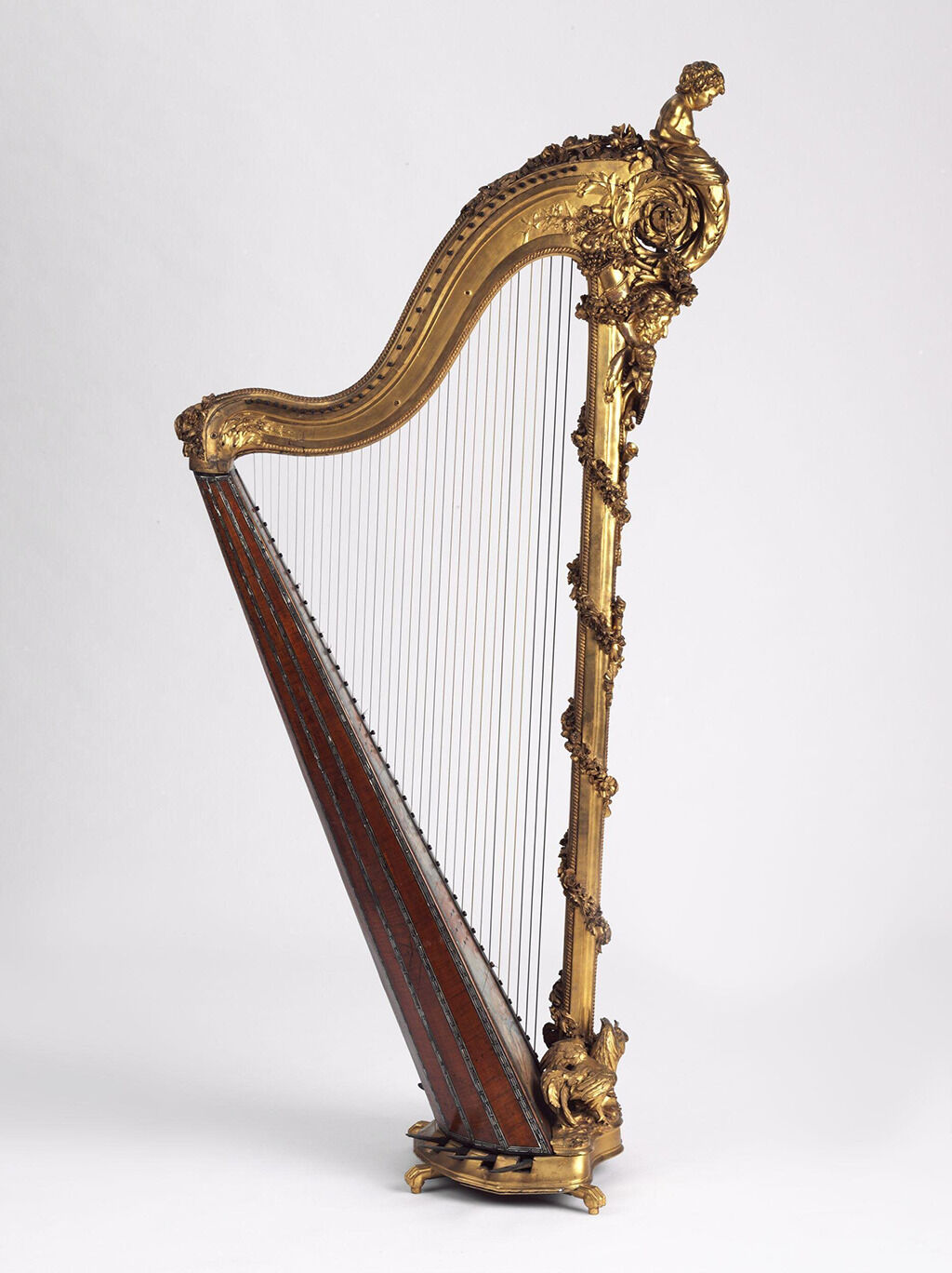 Behind the table stands the splendid, stave-back ebony wood harp with a richly ornamented and gilded head scroll (volute). The instrument may have been made by Georges Cousineau and his son Jacques Georges Cousineau (1760–1824), Parisian harp-makers (facteurs or luthiers) to Queen Marie Antoinette.7Marie Antoinette was an accomplished harpist. Her interest and proclivity on this instrument made it incredibly popular at court. The author is extremely grateful to Florence Gétreau, director of the Institut de Recherche sur le Patrimoine Musical at France’s Centre National de la Recherce Scientifique (CNRS), for her enlightening comments on the comtesse de Langeron’s harp, which she formulated in consultation with Joël Dugot, curator of the Musée de la Musique in Paris and director of the journal Musique ancienne, luthier d’art. Although not visible in the painting, a distinctive feature of this instrument is its pedal mechanism à béquilles (right-angled metal levers), which was perfected around 1780 by Georges Cousineau and his son Jacques Georges Cousineau. Pairs of béquilles were operated by seven pedals that leave the strings in plane; when a pedal was depressed, one lever would turn clockwise and the other counterclockwise, providing a firm grip on the strings and raising the pitch. This invention replaced the more cumbersome hook or crochet strumming mechanisms and expanded the chromatic capabilities of the instrument. This was the type of harp for which Amadeus Mozart wrote his Concerto for Flute, Harp, and Orchestra in C Major (K.299) (1778). The soundboard of the comtesse de Langeron’s harp is decorated with a bouquet of flowers and leaves, which were probably painted on the harp in tempera on a white ground rather than on the bare wood; this is an unusual feature in harps of the period. A sumptuous gilded pedal harp by Cousineau le père dating from ca. 1785 is in the Victoria and Albert Museum, London (Fig. 1), and a considerably less ornate example is in the Horniman Music Gallery, London (acc. no. 3979).8Like Madame de Langeron’s harp, its soundboard is painted with a cluster of flowers.
