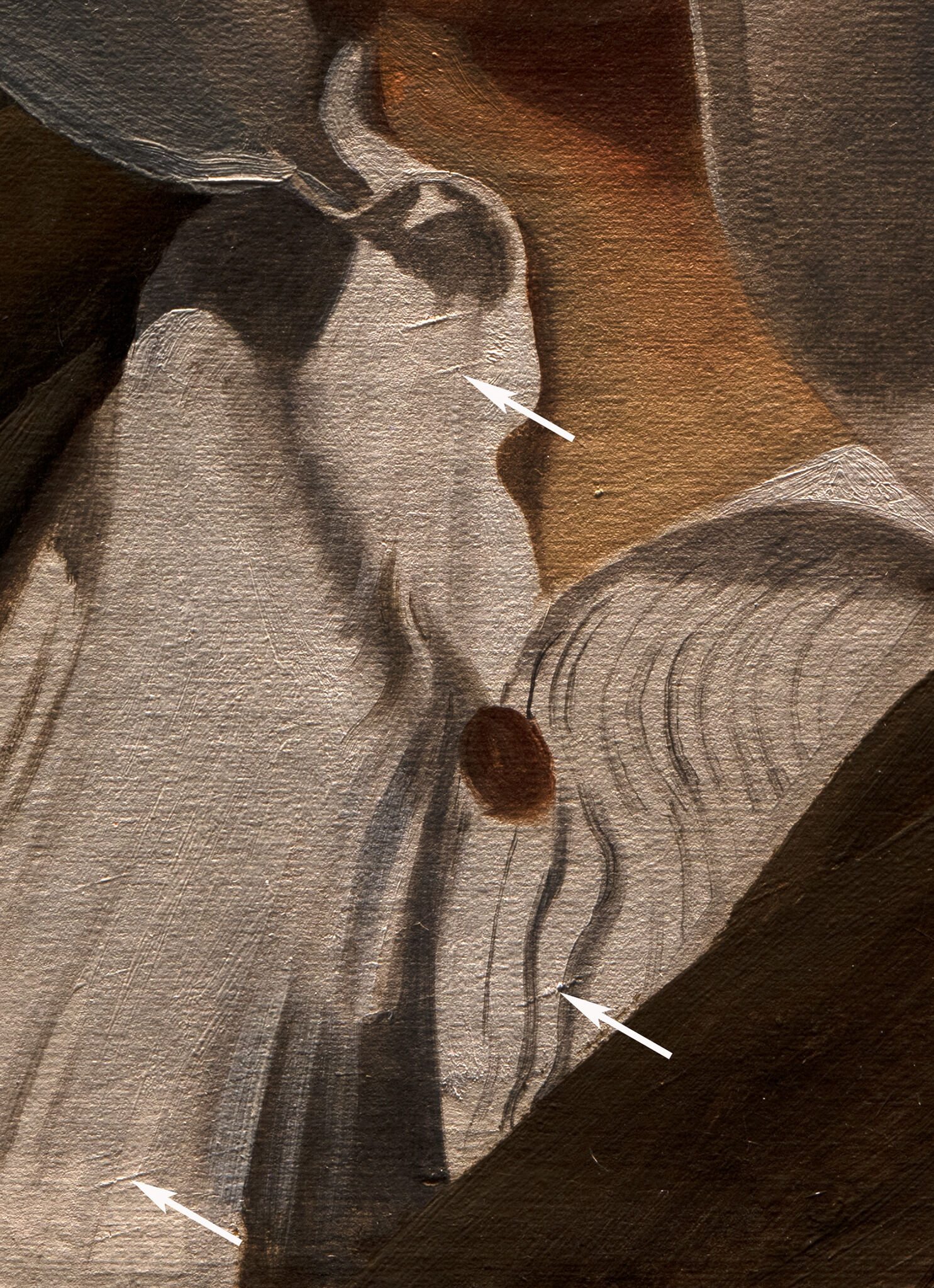 Fig. 6. Detail of Portrait of the Sculptor Paul Lemoyne (ca. 1810–11) with raking illumination, showing several thick, underlying paint strokes that may have been used to position the figure in the early stages of painting