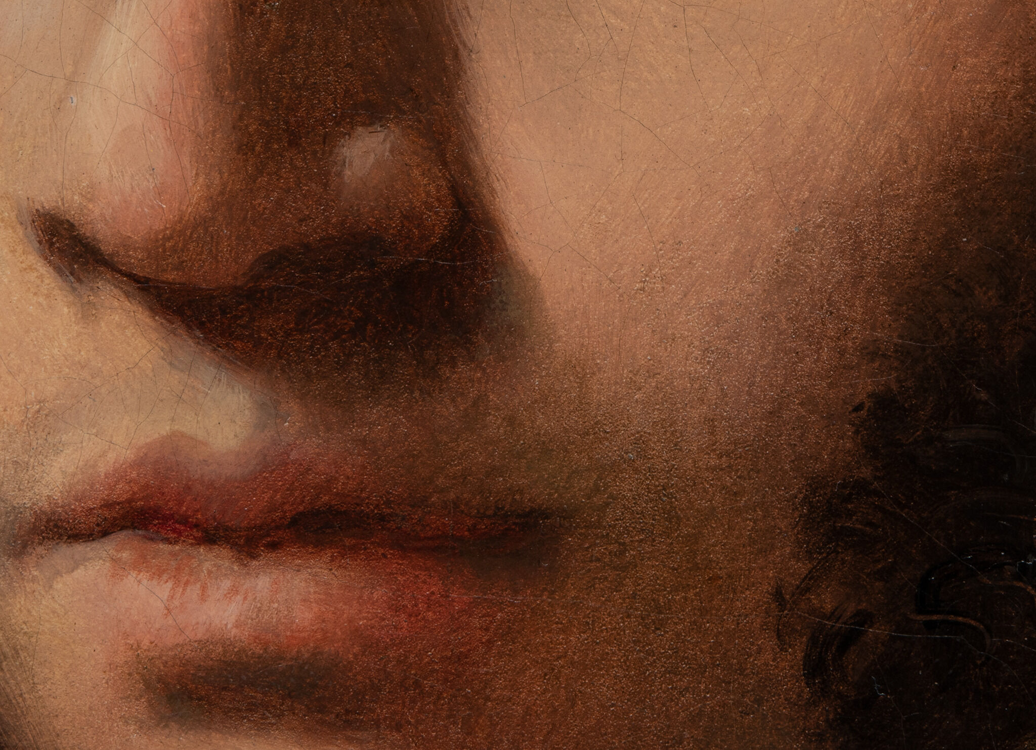 Fig. 7. Detail of Lemoyne’s face, Portrait of the Sculptor Paul Lemoyne (ca. 1810–11), showing numerous washes in the nose, lips, and cheek associated with the initial lay-in of the sitter’s face