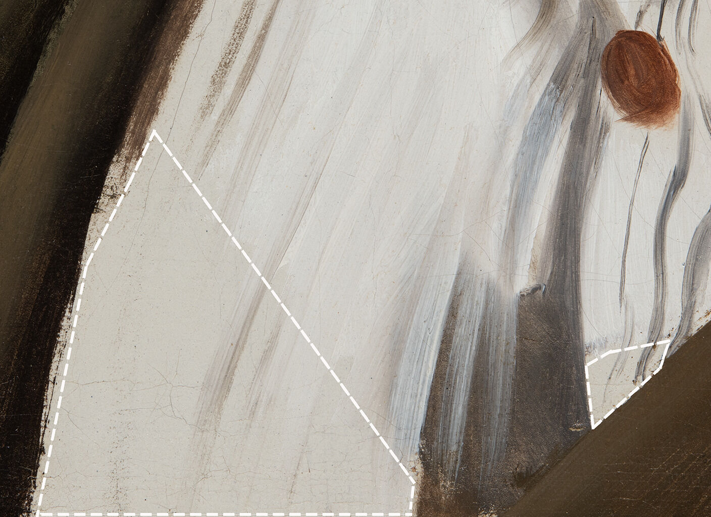 Fig. 12. Detail of the white shirt in Portrait of the Sculptor Paul Lemoyne (ca. 1810–11), showing the large section of exposed ground at the lower left (roughly annotated with dotted lines) and the varied construction of the shirt pleats