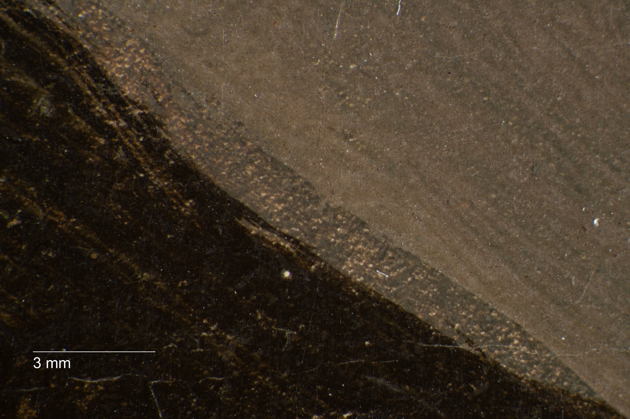 Fig. 13. Photomicrograph of Portrait of the Sculptor Paul Lemoyne (ca. 1810–11), revealing three layers: the green wash of the background, the upper gray-green scumble, and the dark brown contour of the sitter’s overcoat