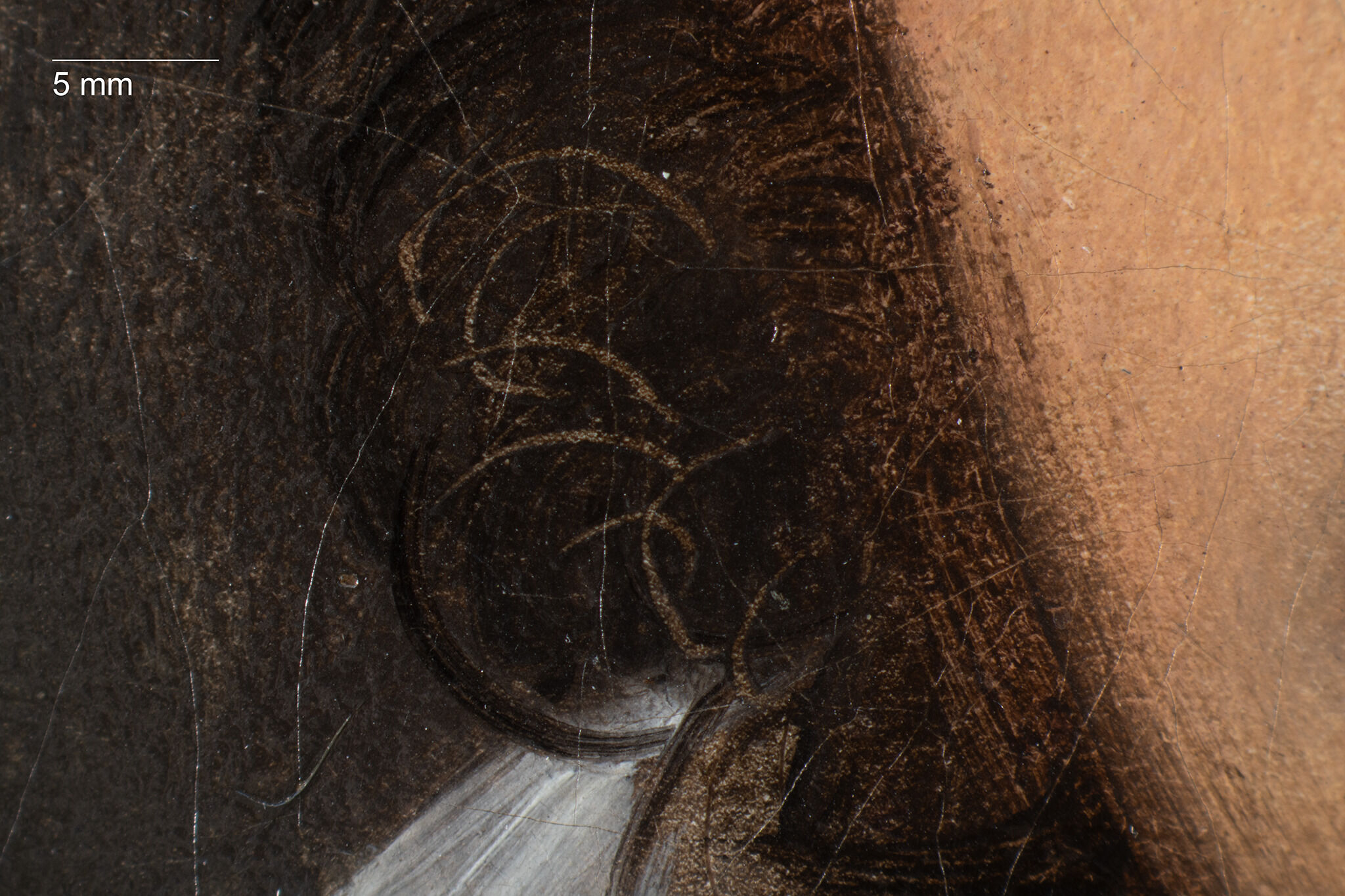 Fig. 14. Photomicrograph of Portrait of the Sculptor Paul Lemoyne (ca. 1810–11), showing the finely incised marks drawn through the wet paint to form the curls of the sitter’s sideburns