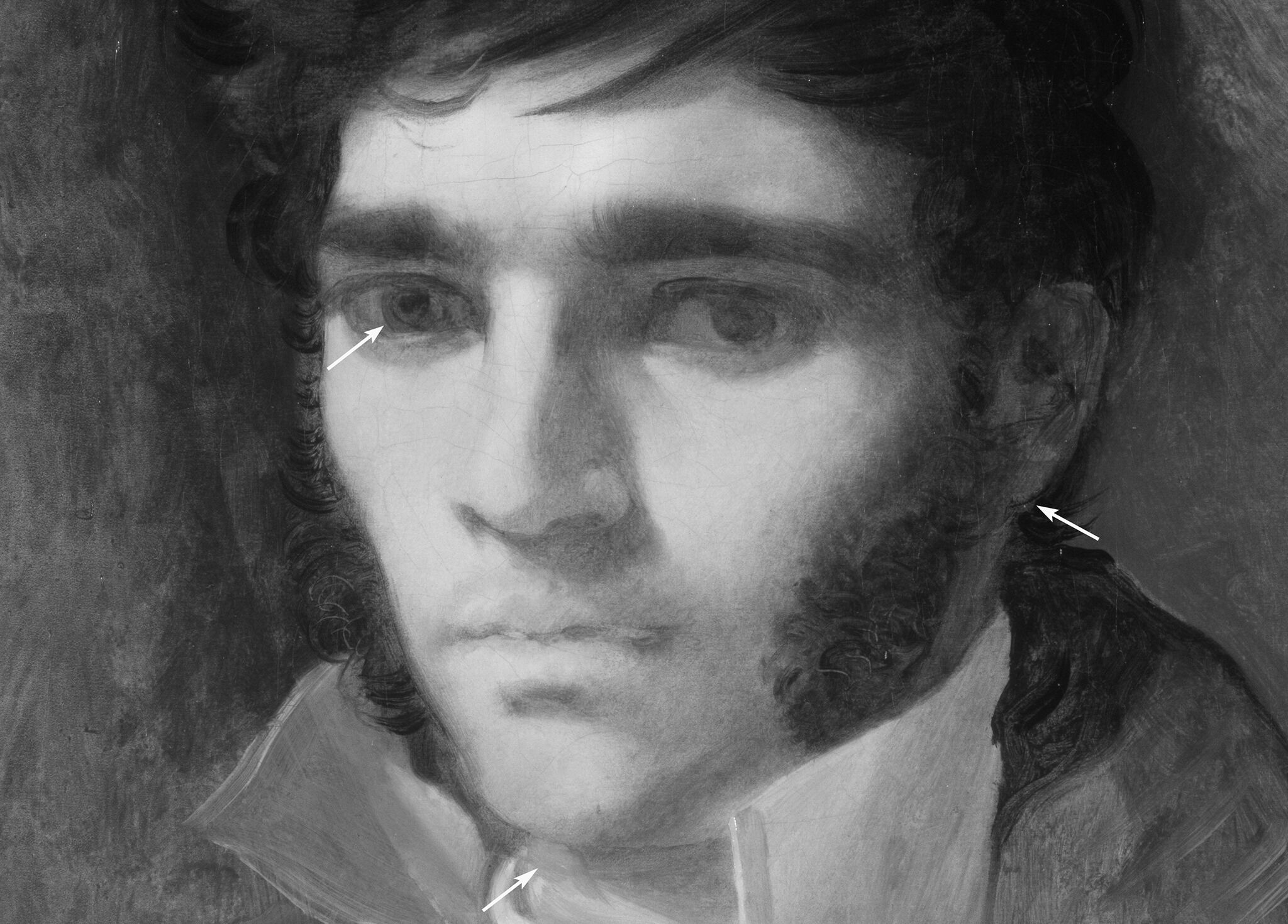 Fig. 16. Reflected infrared digital photograph of Portrait of the Sculptor Paul Lemoyne (ca. 1810–11), showing slight adjustments to the chin, ear, and proper right pupil