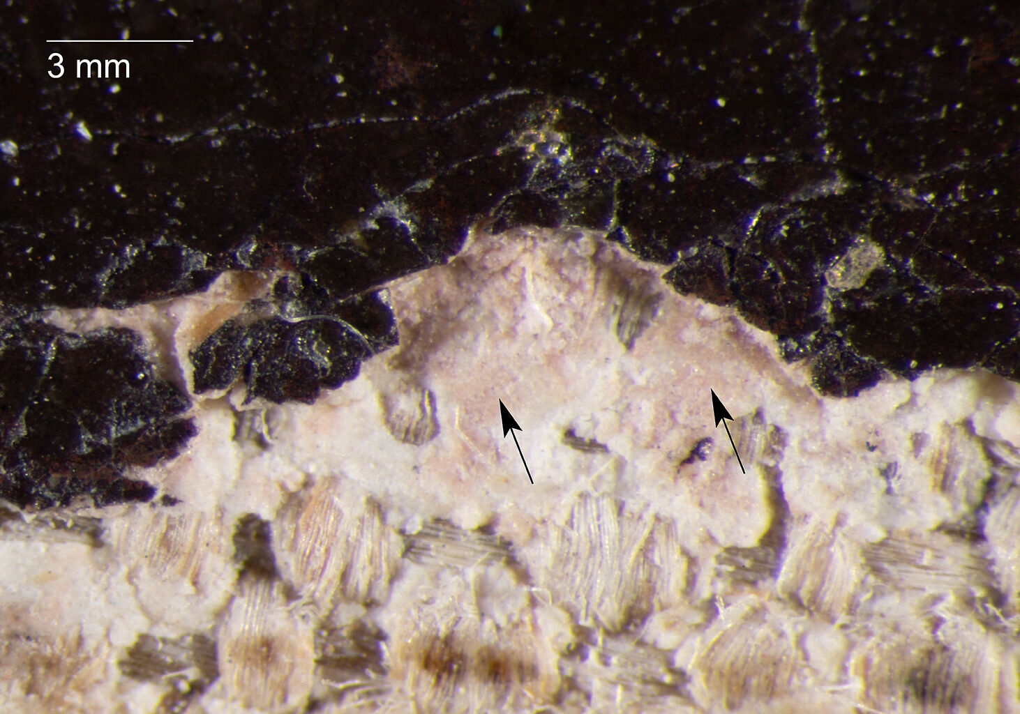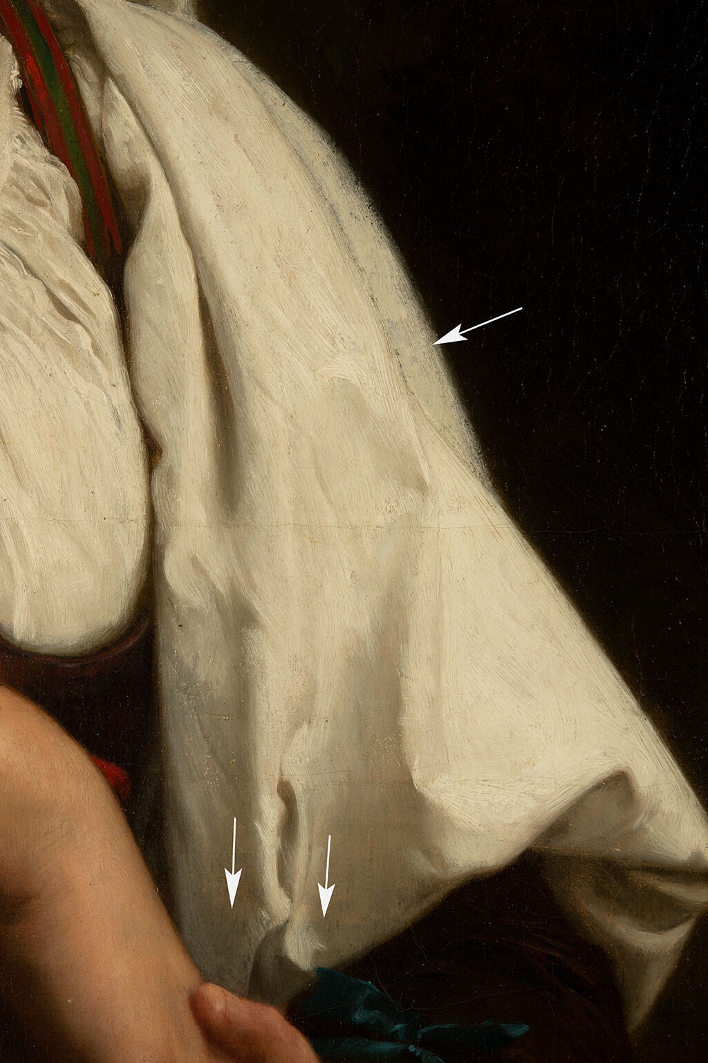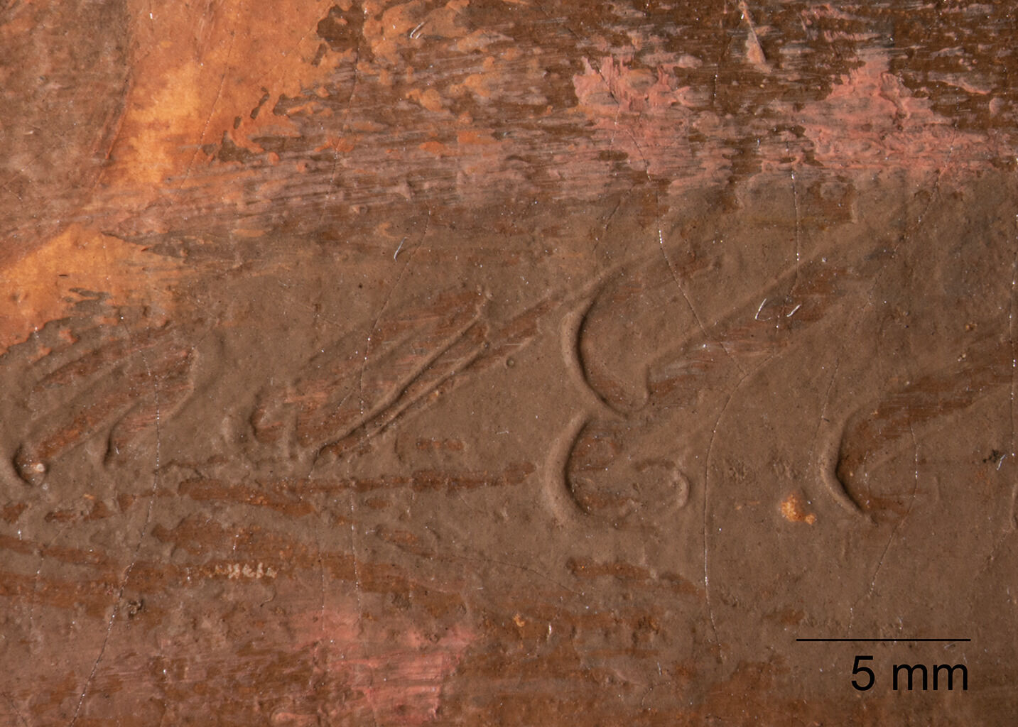 Italian Woman at the Fountain appears to have been executed on a plain-weaveplain weave: A basic textile weave in which one weft thread alternates over and under the warp threads. Often this structure consists of one thread in each direction, but threads can be doubled (basket weave) or tripled to create more complex plain weave. Plain weave is sometimes called tabby weave. canvas with an initial, bright white ground layerground layer: An opaque preparatory layer applied to the support, either commercially or by the artist, to prevent absorption of the paint into the canvas or panel. See also priming layer. followed by an upper ground of pale pink (Fig. 4). The tacking marginstacking margins: The outer edges of canvas that wrap around and are attached to the stretcher or strainer with tacks or staples. See also tacking edge. have been removed, making it difficult to determine whether the ground was commercially prepared, artist-applied, or a combination of the two.1The ground layers beneath Seated Nude (1884; Sterling and Francine Clark Art Institute, Williamstown, MA) consist of a lower commercially applied gray layer that continues onto the preserved tacking margins, over which an upper pale pink ground was applied by the artist. See technical report by Sandra Webber in Nineteenth-Century European Paintings at the Sterling and Francine Clark Art Institute, ed. Sarah Lees (New Haven: Yale University Press, 2012), 84. Equidistant stretcher cracksstretcher cracks: Linear cracks or deformations in the painting’s surface that correspond to the inner edges of the underlying stretcher or strainer members. and areas where paint stops short of the outer edges suggest that the dimensions of the painting (101 x 81 cm), which are close in size to standard-formatstandard-format supports: Commercially prepared supports available through art suppliers, which gained popularity in the nineteenth century during the industrialization of art materials. Available in three formats figure (portrait), paysage (landscape), and marine (marine), these were numbered 1 through 120 to indicate their size. For each numbered size, marine and paysage had two options available: a larger format (haute) and smaller (basse) format. no. 40 figure stretcherstretcher: A wooden structure to which the painting’s canvas is attached. Unlike strainers, stretchers can be expanded slightly at the joints to improve canvas tension and avoid sagging due to humidity changes or aging. (100 x 81 cm),2David Bomford, Jo Kirby, John Leighton, and Ashok Roy, Art in the Making: Impressionism (London: Yale University Press, 1991), 46. have not been substantially altered.