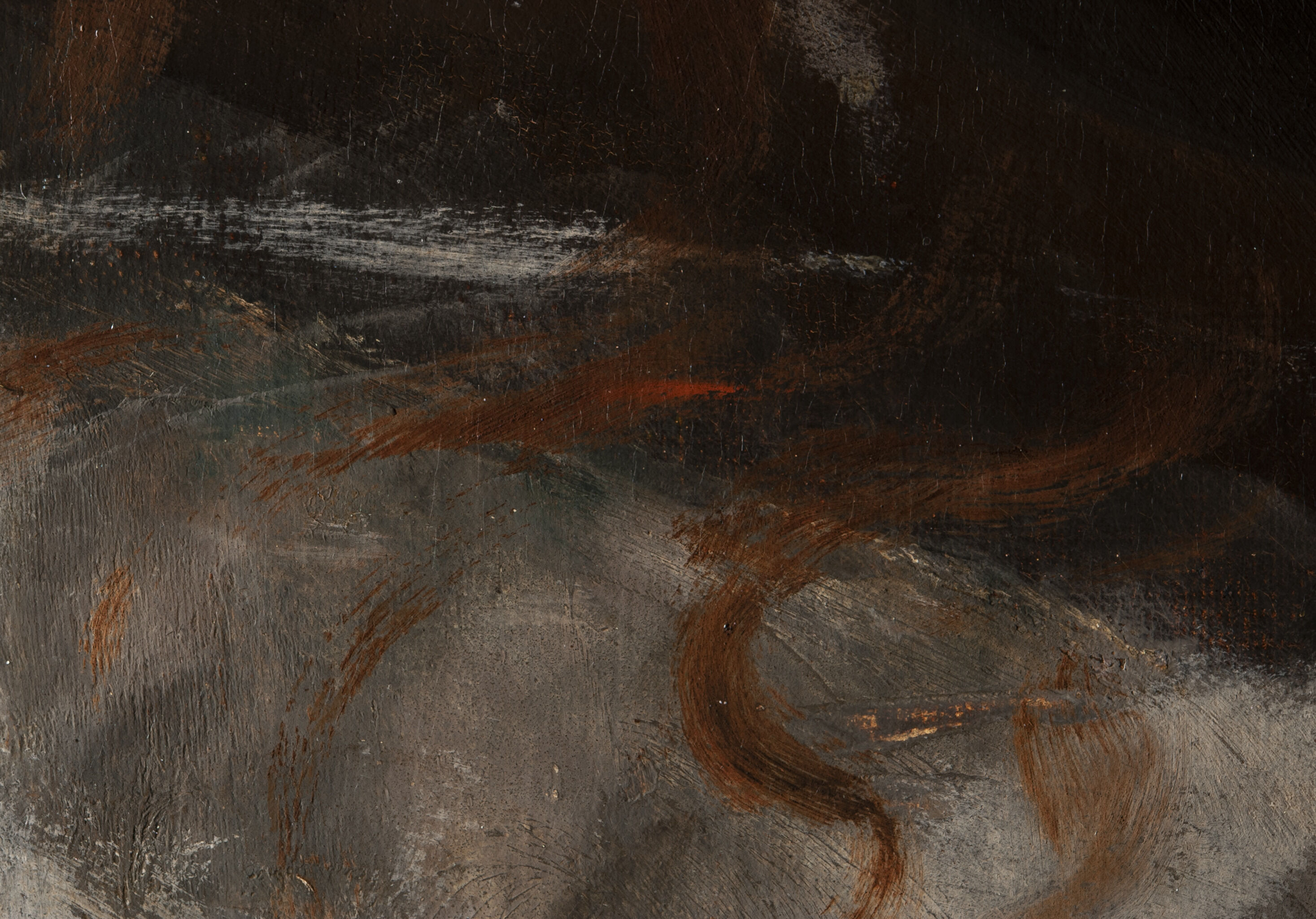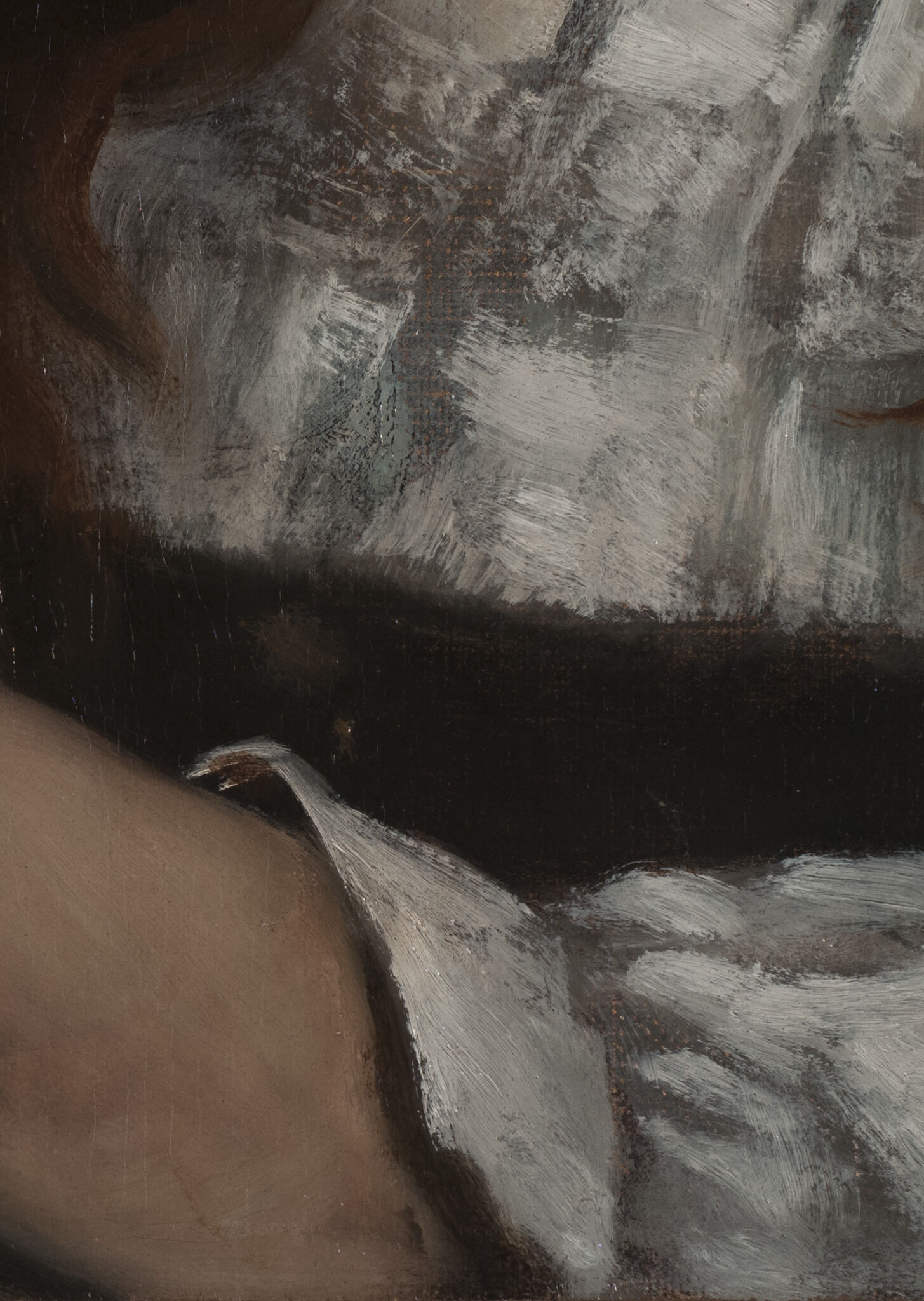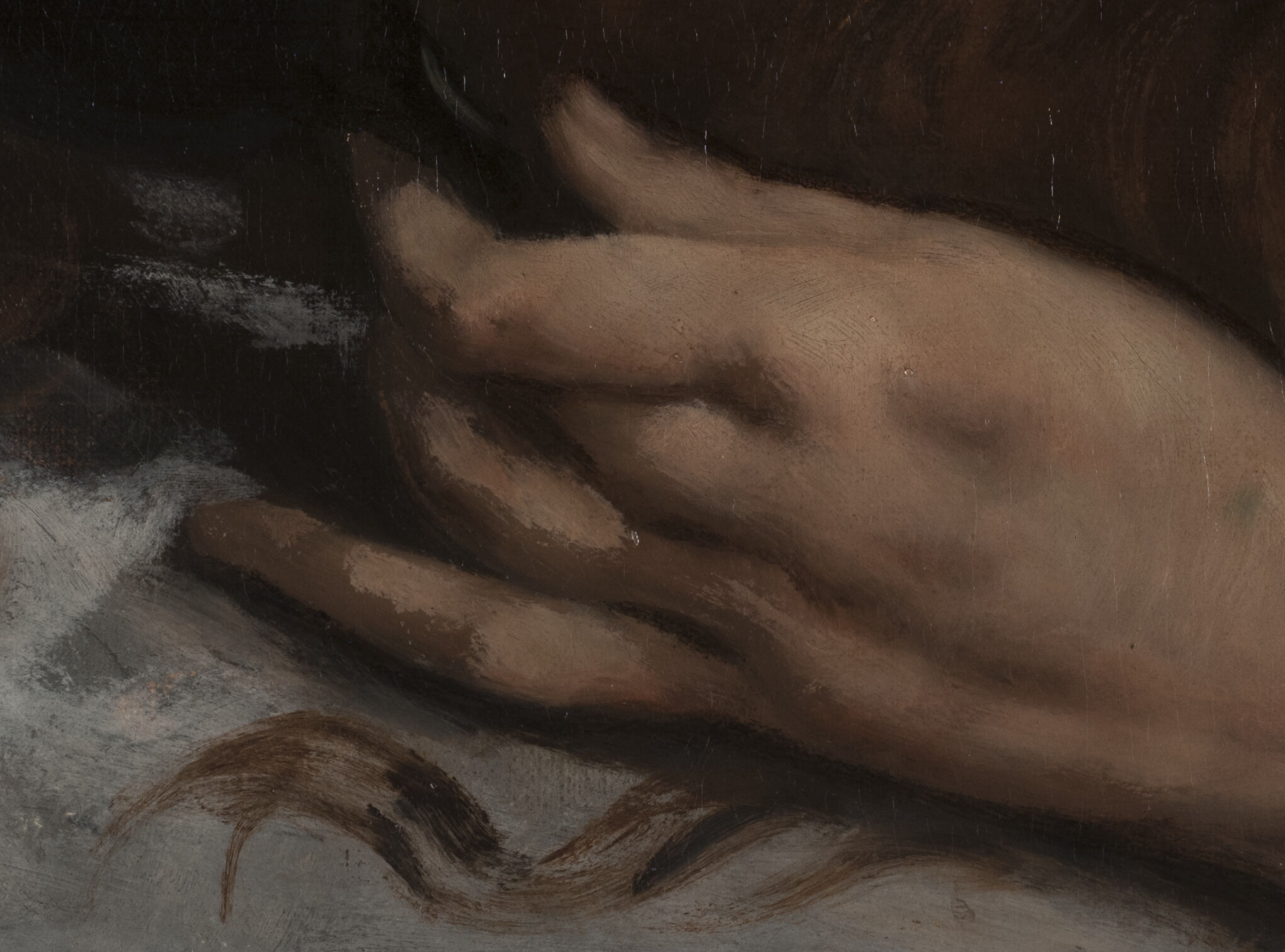 Despite these past damages, what remains of Courbet’s original handling of hair and skin reveals the genius for which he is known. Using a technique learned from studying Old Master paintings, Courbet began by covering the white-primed canvas with a reddish-brown imprimatura that gives an overall warmth to the palette and, when left exposed, serves as a midtone in areas such as Hiffernan’s hair. Employing a variety of brushes and his trademark palette knife, Courbet constructed forms by applying thin layers of paint in a limited range of colors. To render Hiffernan’s pale complexion, he used a blue-gray undertone to suggest both contours and delicate veins running beneath her translucent skin. It is Courbet’s Realism—his unrivaled ability to render the appearance of living, breathing skin and touchable, silky hair—that ultimately makes his figures so desirable.