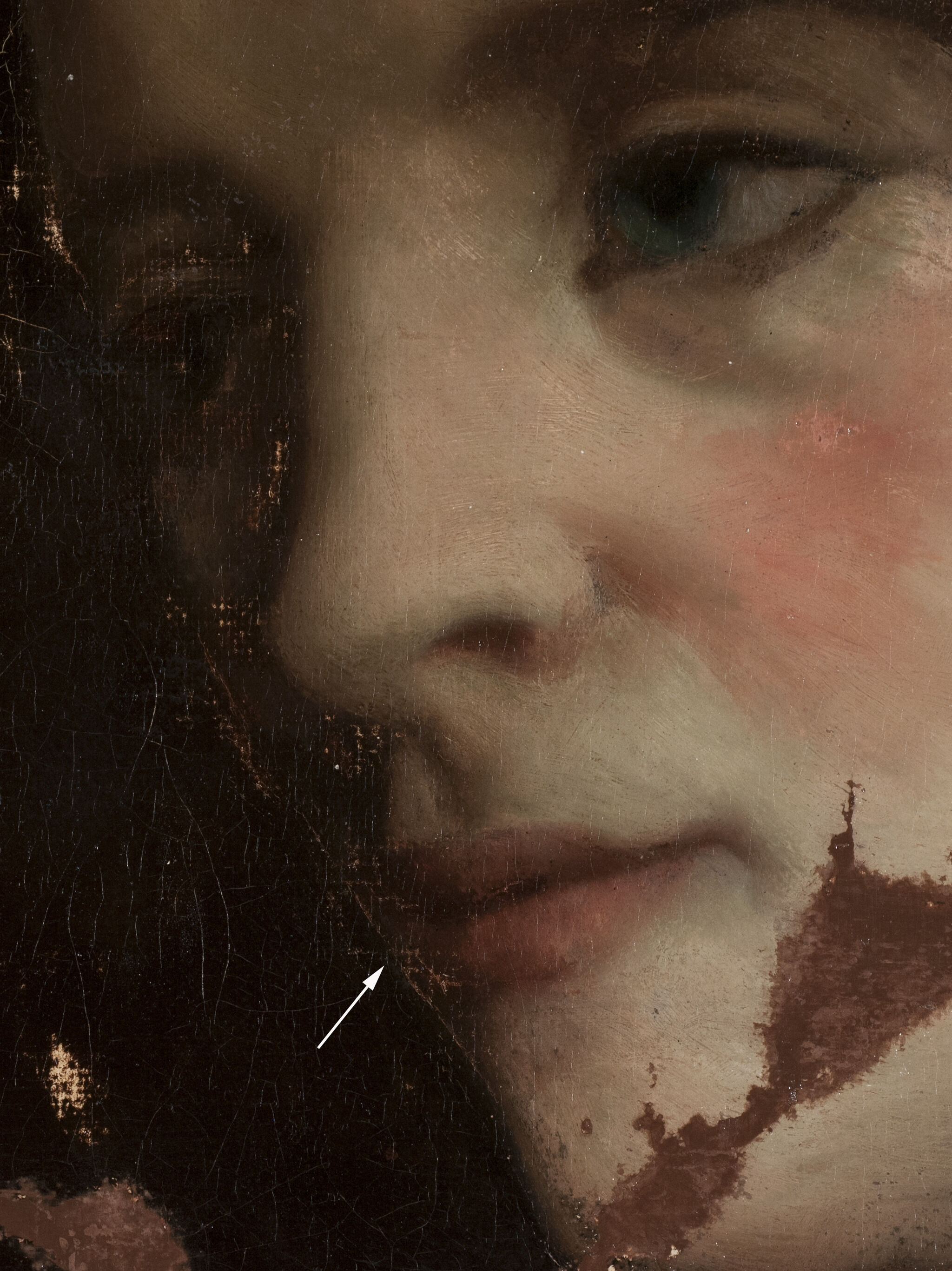 Fig. 9. Detail of an incised line along the contour of the sitter’s face, Jo, the Irish Woman (ca. 1866–68). This image was captured during the 2012 treatment.
