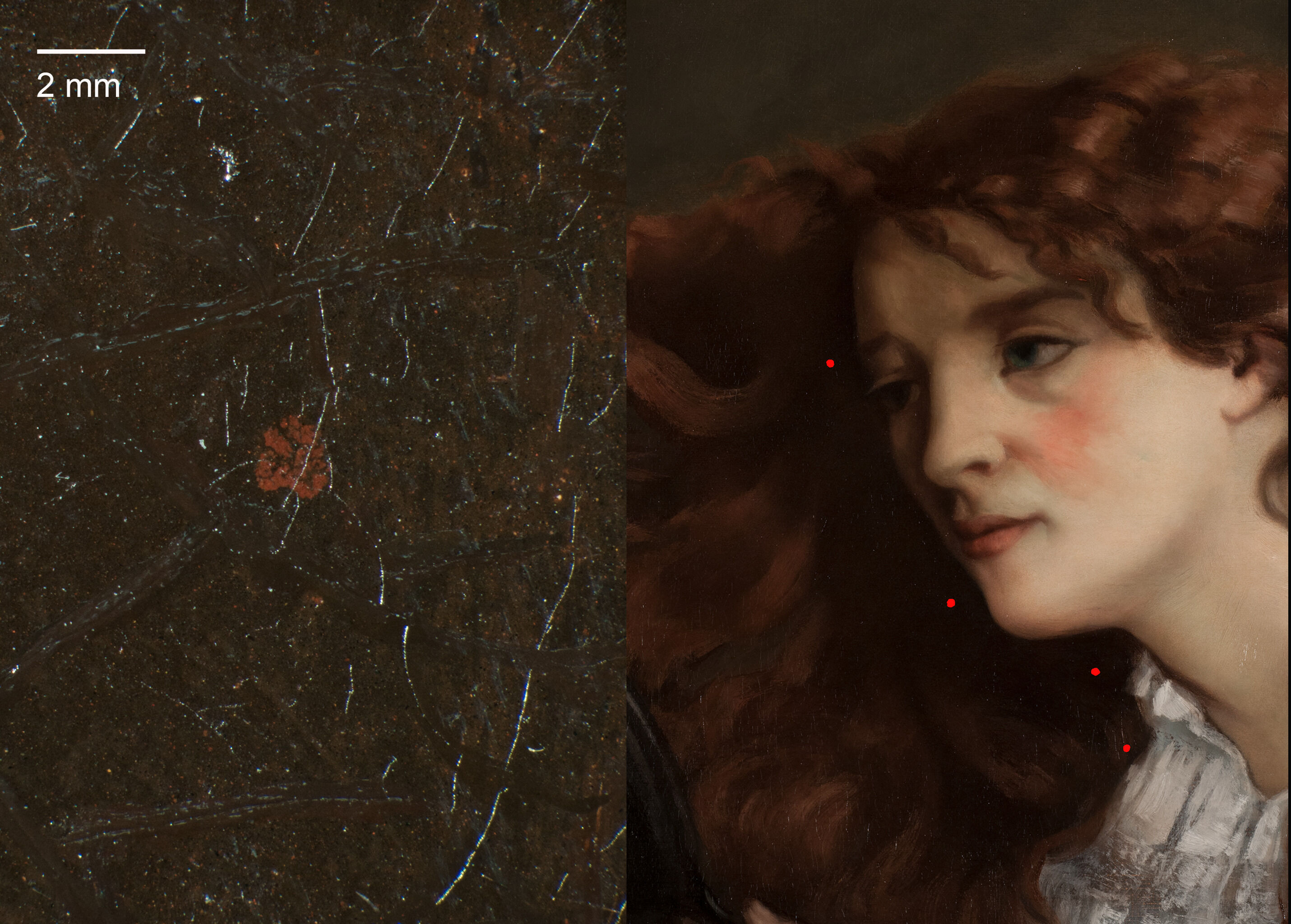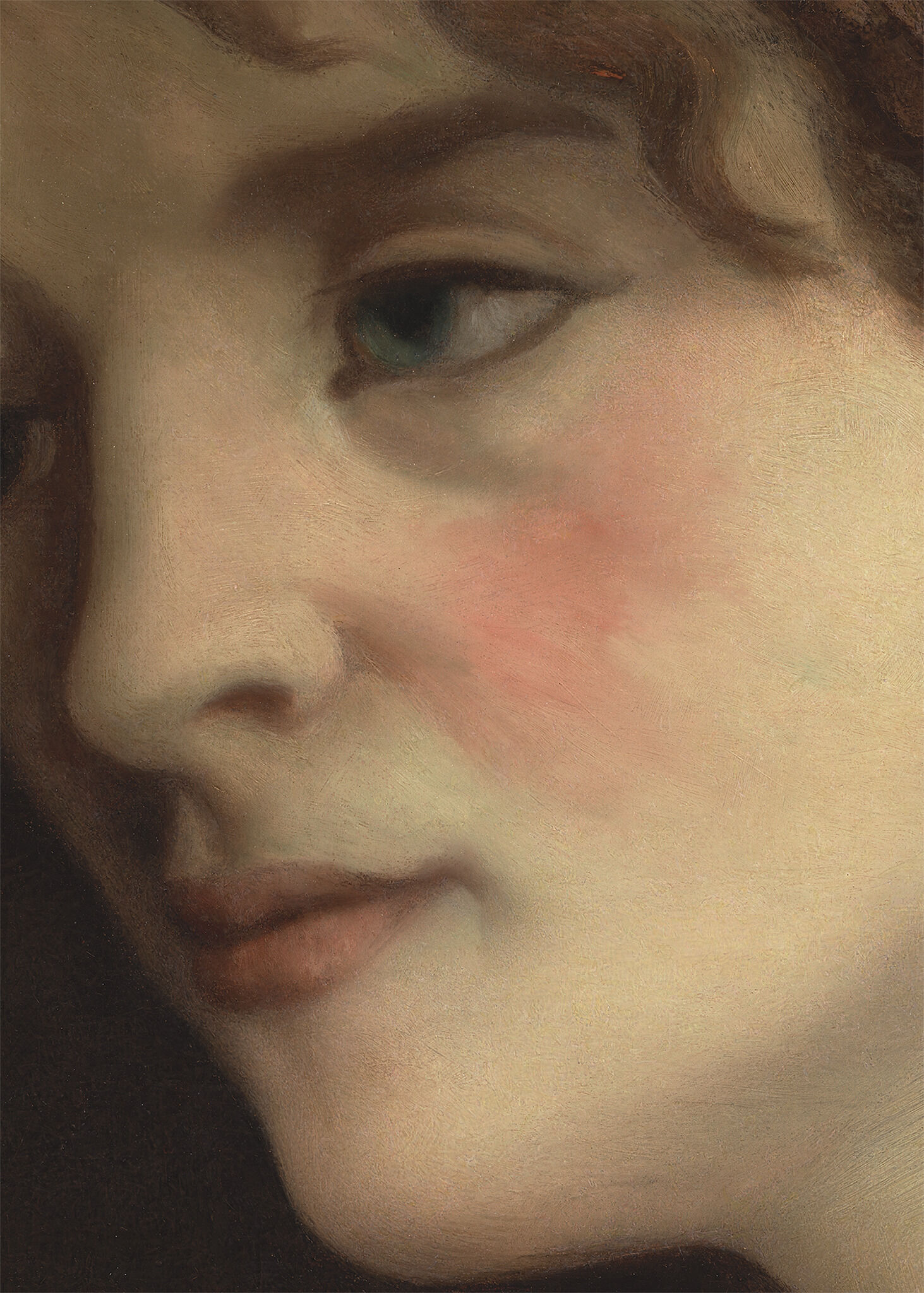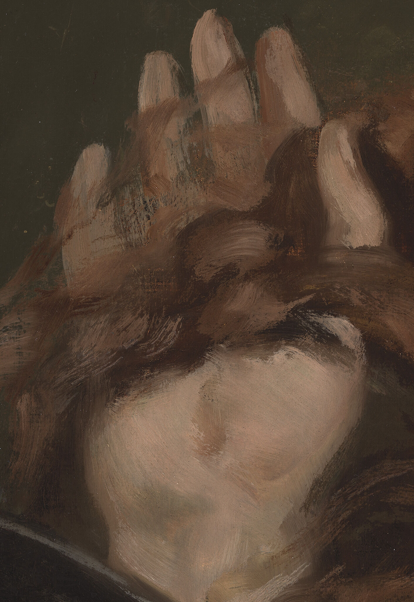 It is important to note that the surface appearance of the Nelson-Atkins painting has been greatly altered in certain areas of the composition. Prior to the Museum’s acquisition in 1932, the canvas was punctured in the middle of the composition. The resulting Y-shaped tear extends into Hiffernan’s chin, jawline, and the hair that envelops the left side of her face. In addition to areas of loss associated with the tear, a past overcleaning stripped the midtones and highlights from substantial areas of hair and the proper right side of the figure’s face, producing a flattened and distorted effect. A significant and sensitive restoration campaign, completed in 2015 by Mary Schafer, Nelson-Atkins painting conservator, resulted in the successful reconstruction of lost and damaged elements, returning a sense of depth, subtlety, and volume to the painting.26See painting report of examination, May 15, 2002, and painting technical record of treatment, February 2, 2015, by Mary Schafer, NAMA paintings conservator, NAMA conservation files. Schafer’s study and treatment of this painting from 2012 to 2015 was undertaken in close collaboration with this essay’s author during her tenure at the Nelson-Atkins Museum of Art as associate curator of European Painting and Sculpture.