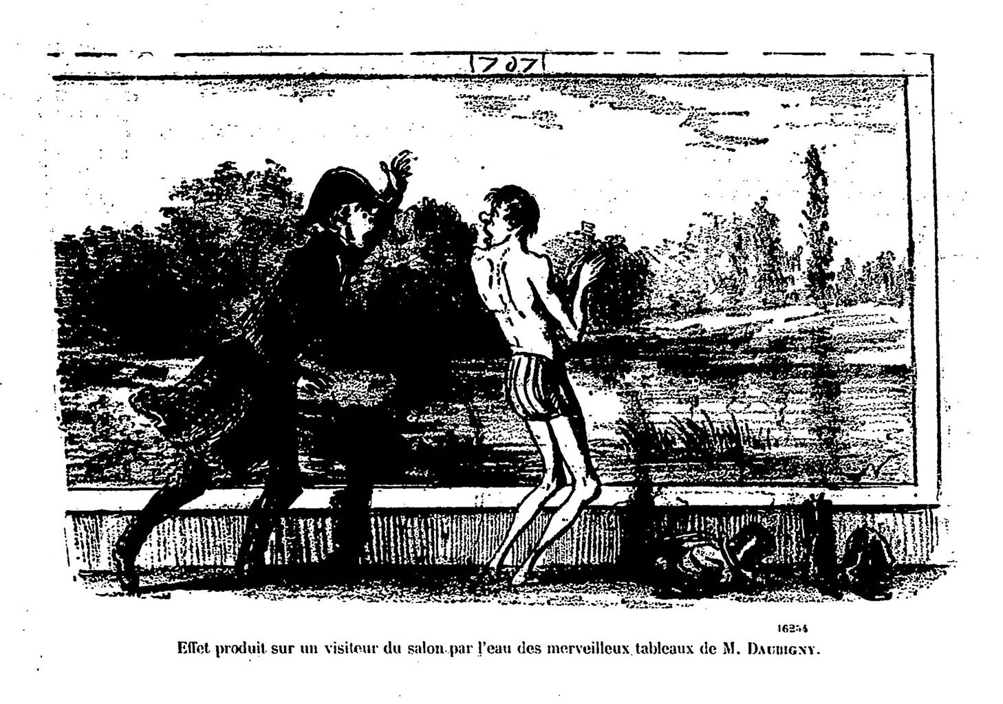 Daubigny produced a wide range of work: from early historical landscapes, to agricultural harvest scenes, to Normandy Coast marines, to châteaux views. From the late 1850s on, however, he became particularly known as a river painter. The artist constructed a studio boat, known as Le Botin, in 1857, which facilitated his plein-airen plein air (adjective: plein-air): French for “outdoors.” The term is used to describe the act of painting quickly outside rather than in a studio. study. Daubigny’s Banks of the Oise, painted fifteen years before the Nelson-Atkins panel and shown at the 1859 SalonSalon, the: Exhibitions organized by the French Royal Academy of Painting and Sculpture (Académie Royale de Peinture et de Sculpture) and its successor the Academy of Fine Arts (Académie des Beaux Arts), which took place in Paris from 1667 onward., earned him widespread praise as a painter of the “impression,” years before the Impressionists. Purchased in 1863 by the Musée des Beaux-Arts of Bordeaux, it was even satirized in the press for its extreme naturalism. The French photographer, caricaturist, and journalist Félix Nadar (1820–89) imagined a Salon spectator stripping down to his swimming trunks and trying to dive into the painting (Fig. 1). Thereafter, Daubigny continued to produce large-scale Oise views, as in his 1863 Salon painting Banks of the Oise (Saint Louis Art Museum).