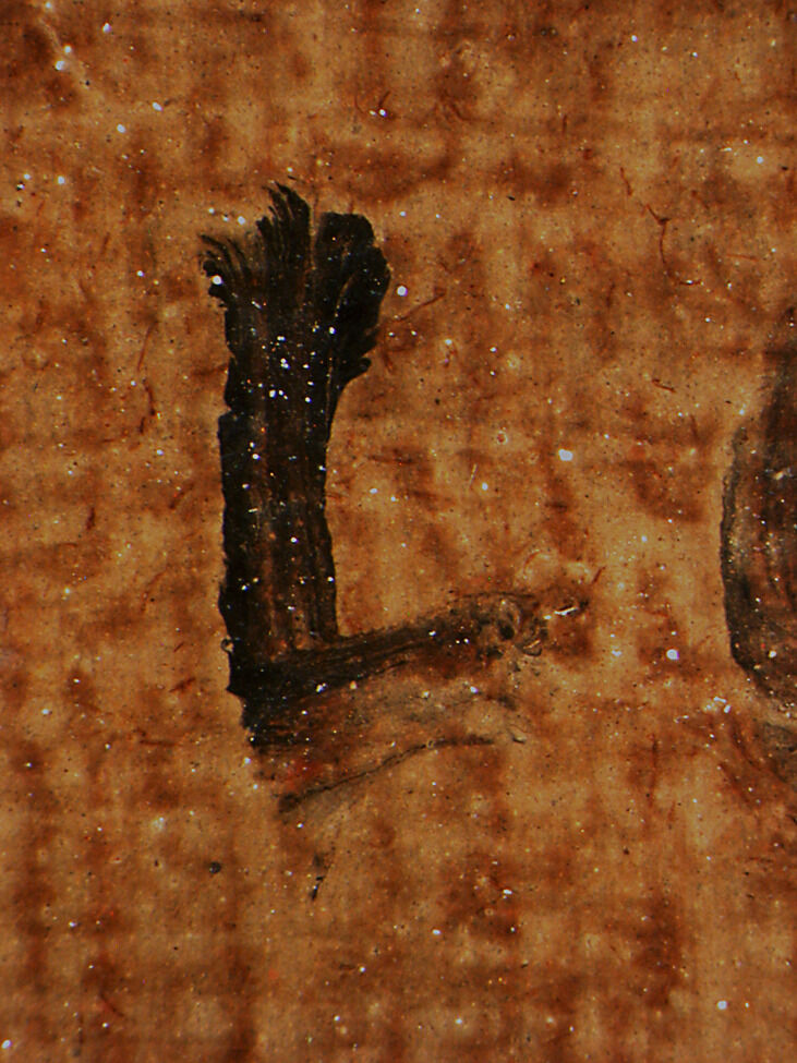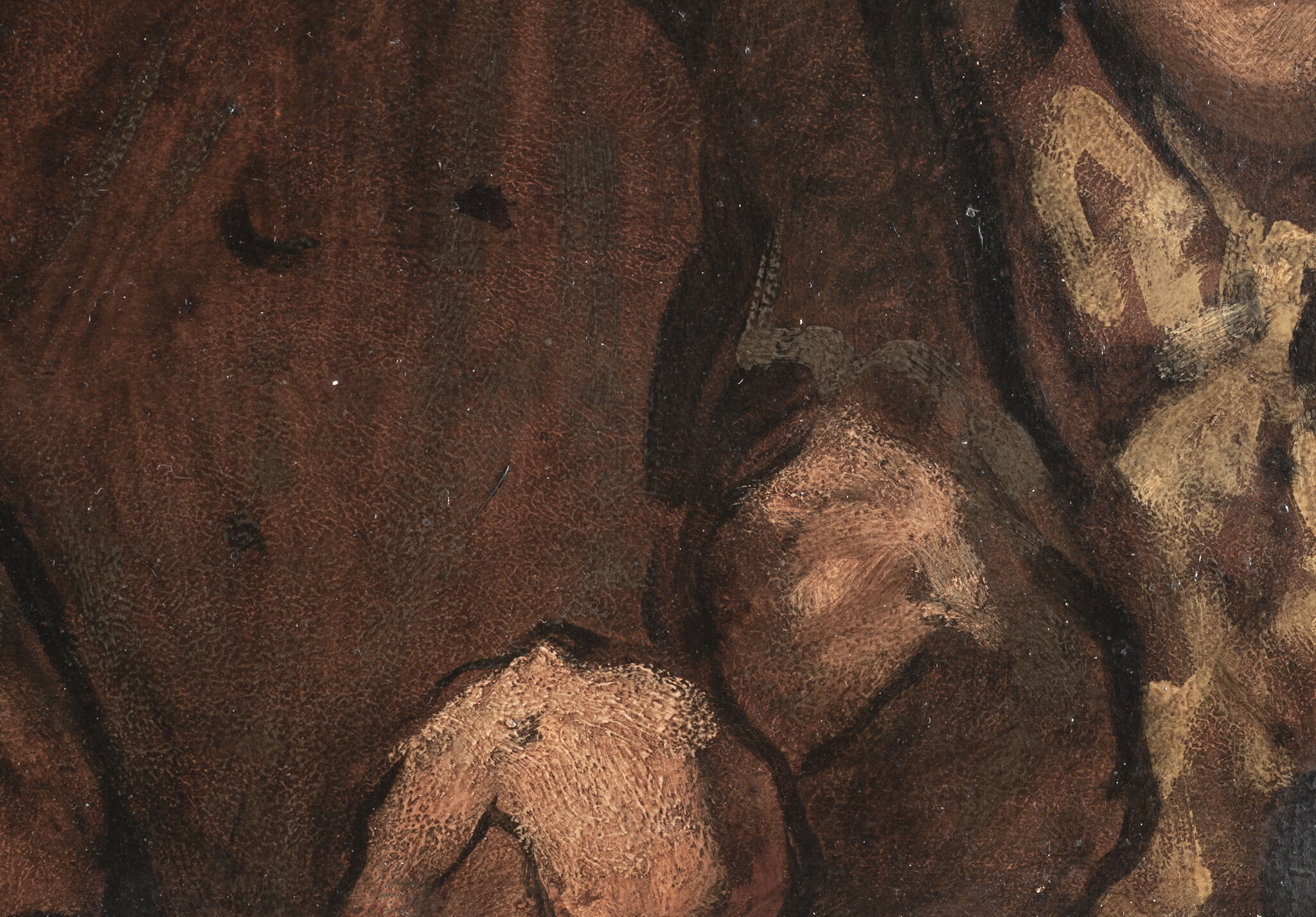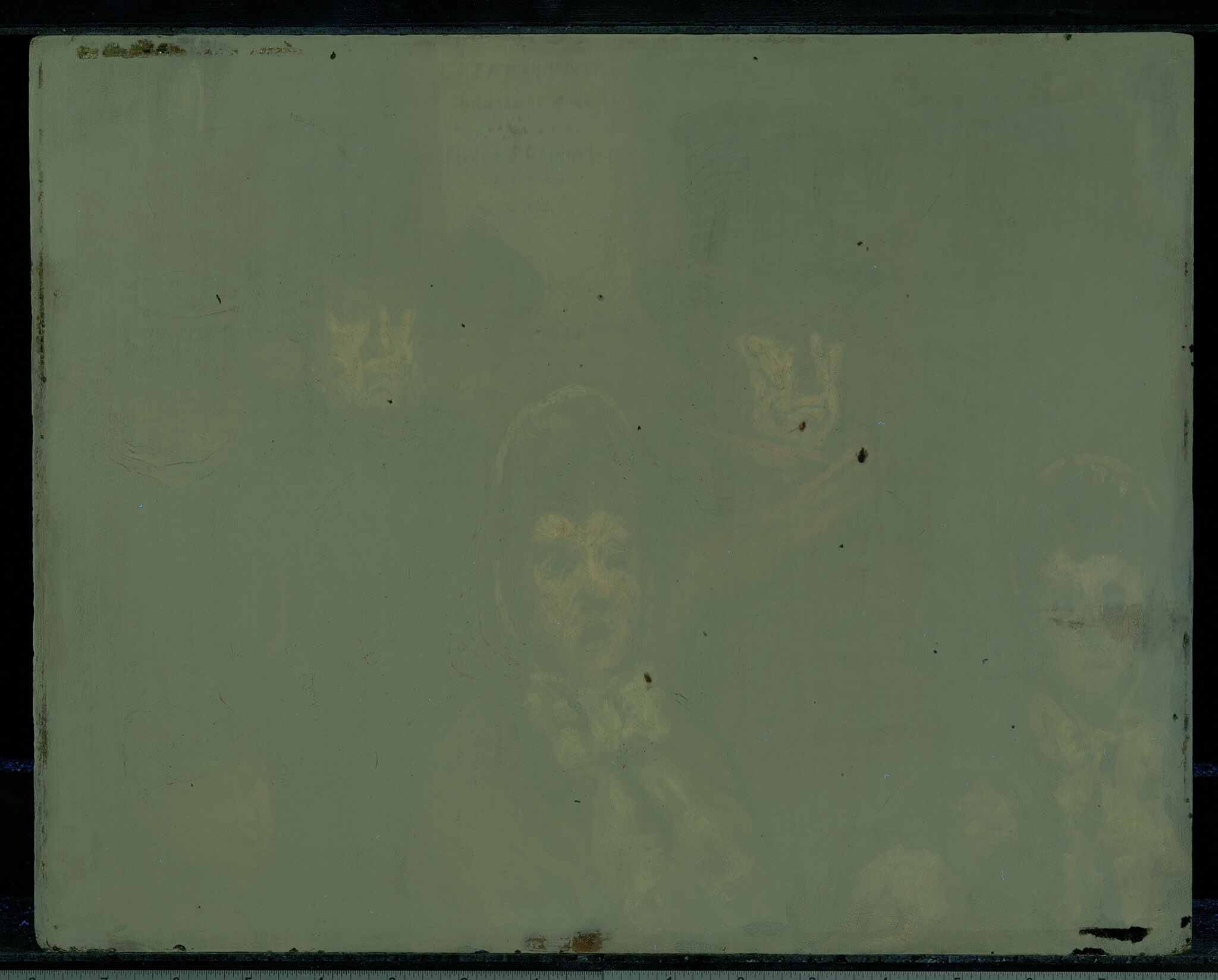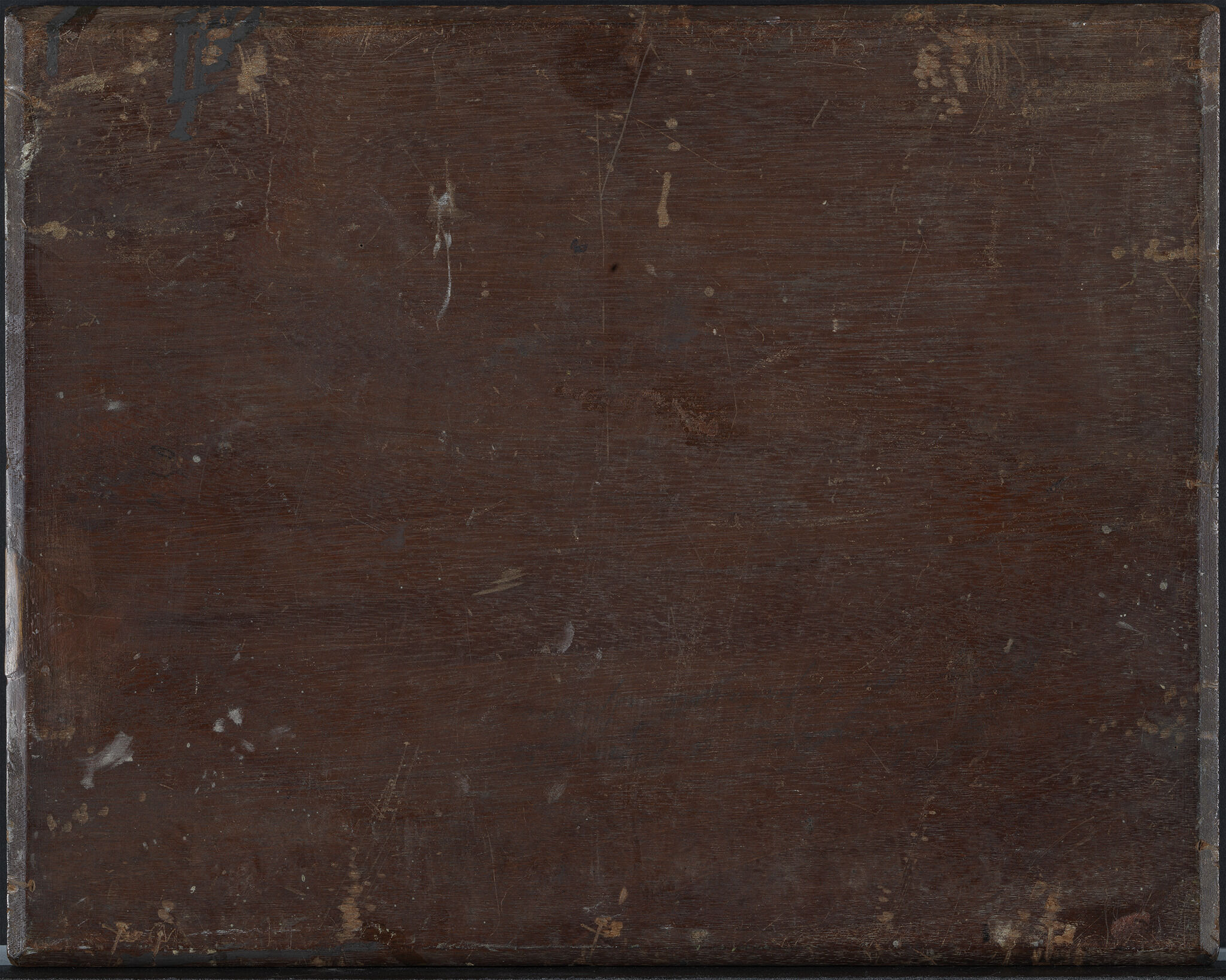 Daumier struggled financially and occasionally repurposed materials for his drawing and painting supports.9Campbell and Caplan, eds., Daumier 1808-1879, 23. Two Daumier works in the collection of the Musée d’Orsay—Le Baiser (ca. 1845) and Martyrdom of Saint Sébastian (ca. 1849)—were painted on panels that were once part of a cabinet or other piece of furniture.10EROS database 2.0, Department of Archives and Innovative Information Technology, Center for Research and Restoration of Museums of France, F13445 and F10969, accessed August 7, 2011.,11Campbell and Caplan, eds., Daumier 1808-1879, 23. Notably, there are also examples in which Daumier repurposed the painting supports of other artists. The Uprising (1848 or later; Phillips Collection, Washington, DC) was executed on top of a discarded canvas featuring a portrait from a much earlier period,12Elizabeth Steele, paintings conservator, Phillips Collection, noted in her 1999 examination report that the underlying portrait “does not bear any resemblance to any style of painting by Daumier, but rather, appears to be from a much earlier period (17th–19th century).” and in another instance, Daumier reused the reverse side of a watercolor fragment painted by another artist.13See Campbell and Caplan, eds., Daumier 1808-1879, 23.