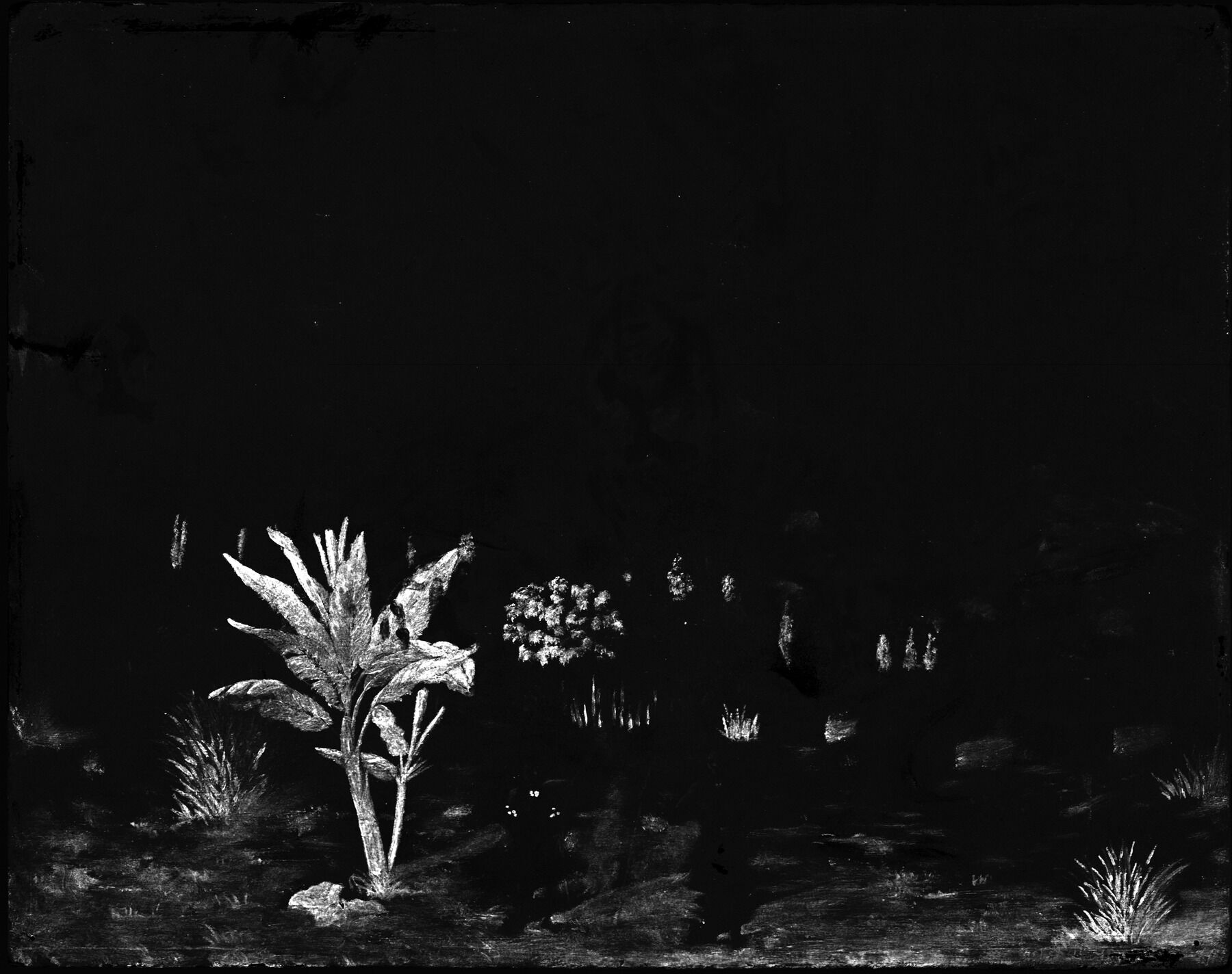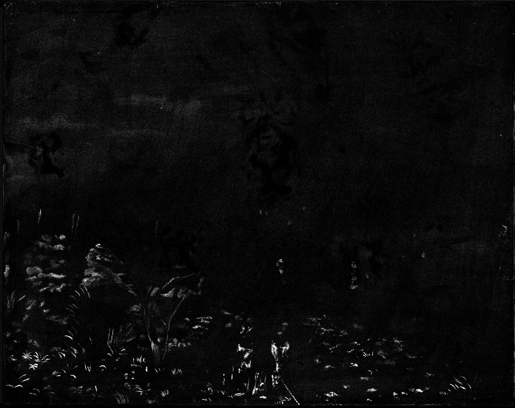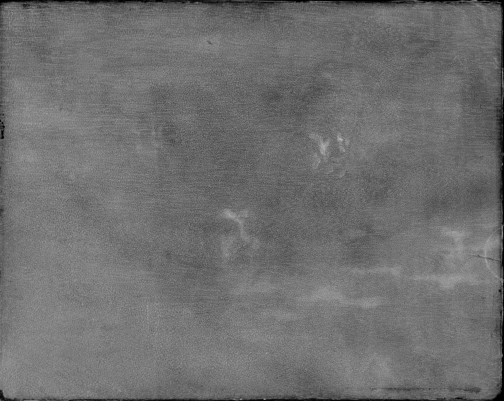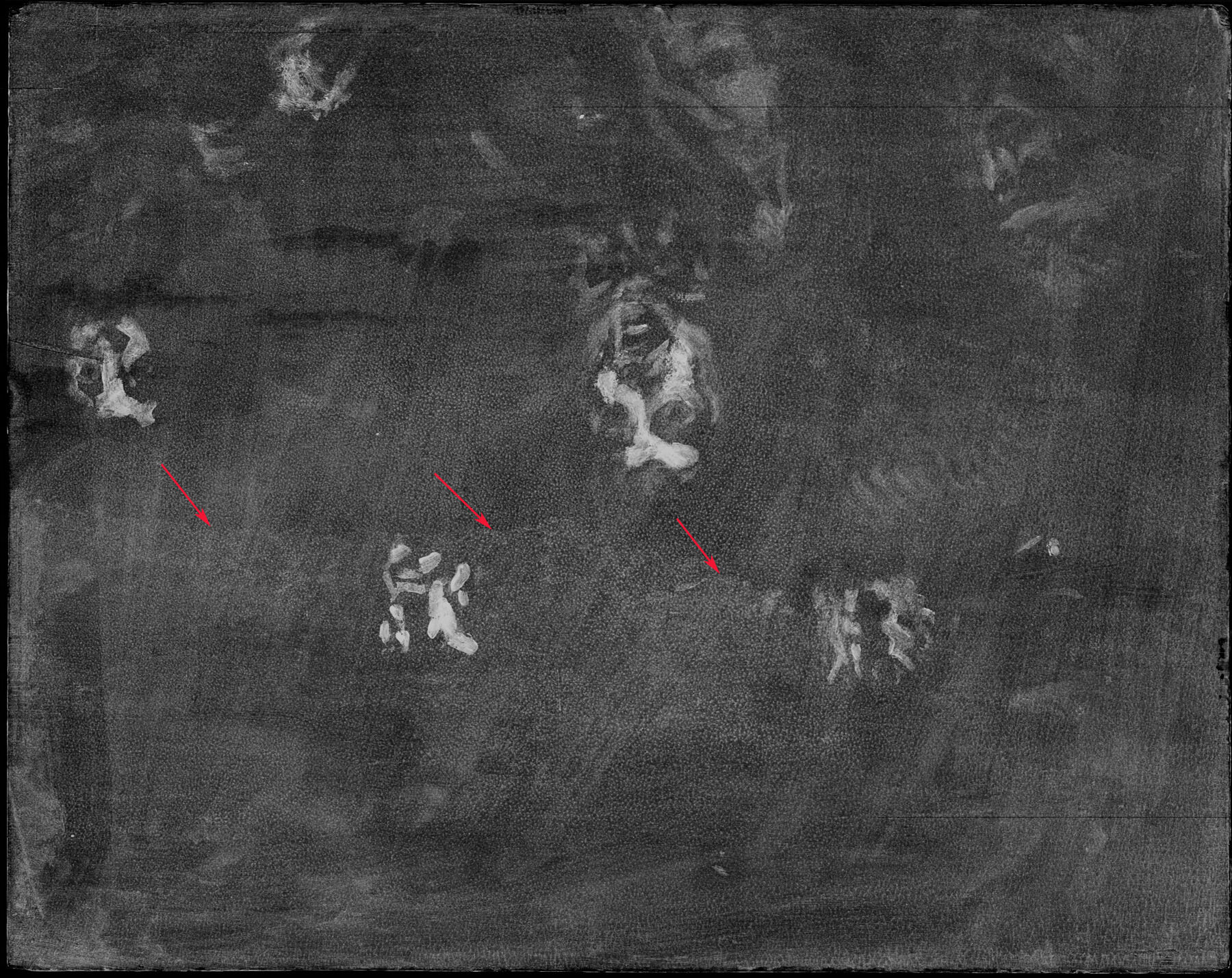 The film-based radiograph of Exit from the Theater was captured under the following conditions: 80 kV, 1 mA, 20 seconds. See radiograph no. 502, June 14, 2010, NAMA conservation file, 32–31.