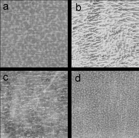 Figs. 8a–d. 8a. radiograph detail of Fig. 7, Exit from the Theater (after 1863); 8b. test panel with brayer-applied lead white; 8c. The Print Collector (ca. 1857/1863; Art Institute of Chicago, 1957.305); 8d. French Theater (ca. 1856; National Gallery of Art, Washington DC, 1963.10.13). Brighter pixels correlate to radio-opaque material. Each field of view is 2 centimeters.
