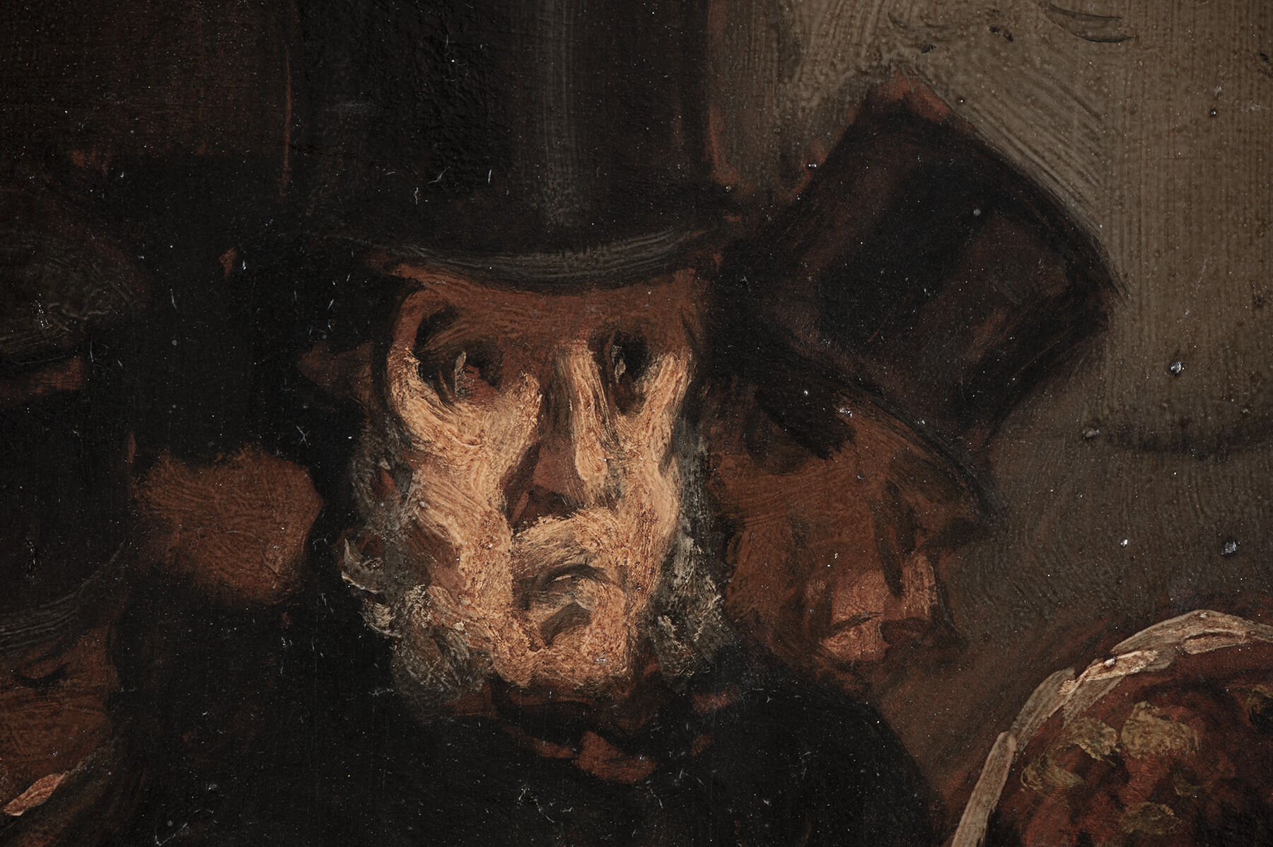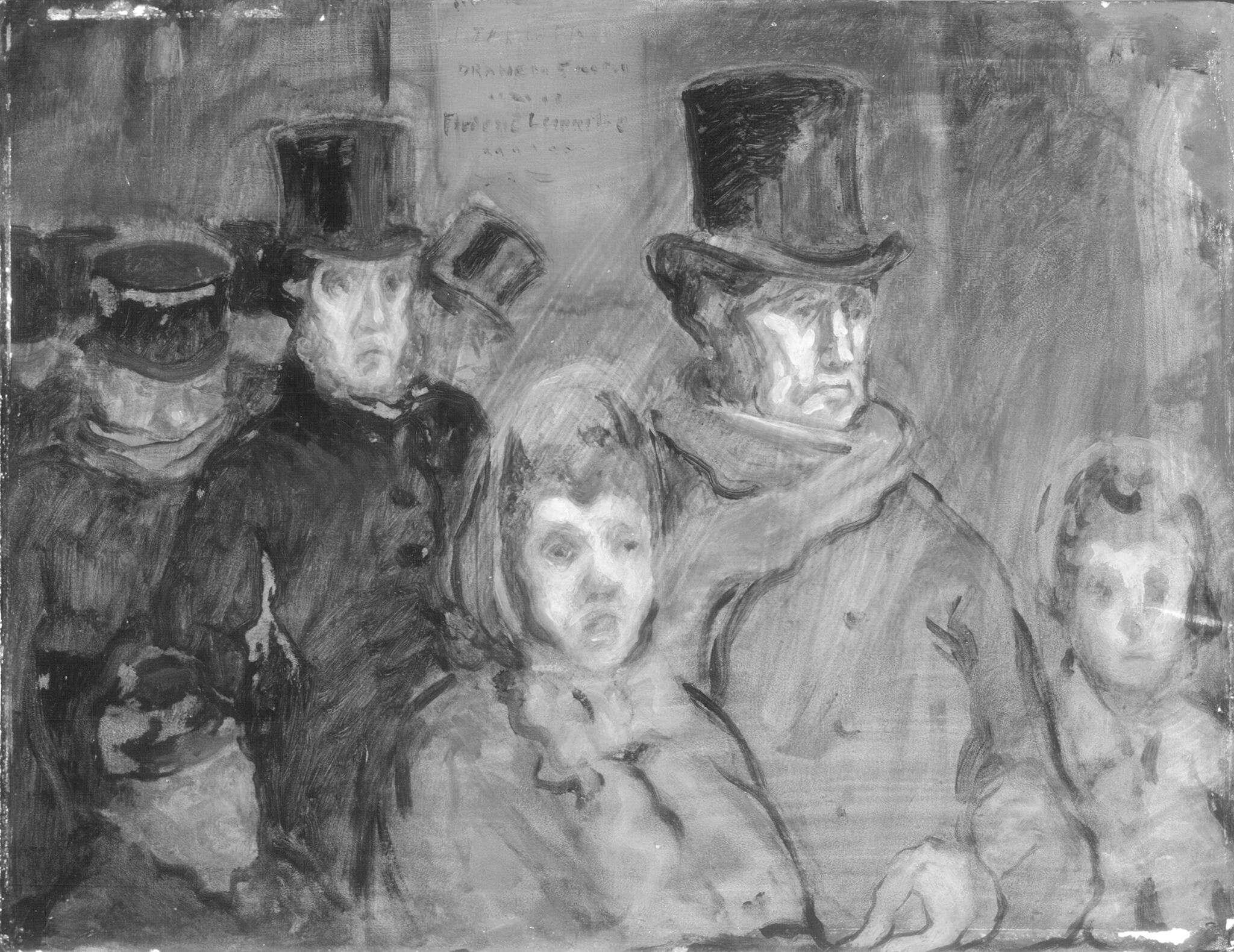 Forgeries after Daumier’s prints are an acknowledged problem.5Forgeries began in earnest following the 1889 Exposition Centennale, which drove prices higher and attracted many forgers. See K. E. Maison, “Daumier’s Paintings and Drawings,” in Daumier Paintings and Drawings, exh. cat. (London: Arts Council of Great Britain, 1961), 18–19. These fraudulent works capitalized on accepted subject matter and misunderstandings of the artist’s technical development and process in response to increasing market demands for his work. A plethora of weak copies, with variations after well-known compositions, were the result. Bruce Laughton, a leading recent authority on Honoré Daumier, strongly questioned the attribution of Exit from the Theater to Daumier on these grounds, although he never saw the work in person.6See letter from Simon Kelly, former associate curator, The Nelson-Atkins Museum of Art, to Bruce Laughton, December 27, 2008, NAMA curatorial files. Subsequent scholars have generally deferred to his opinion, and as a result the painting has spent more than twenty years off view in storage awaiting further study.