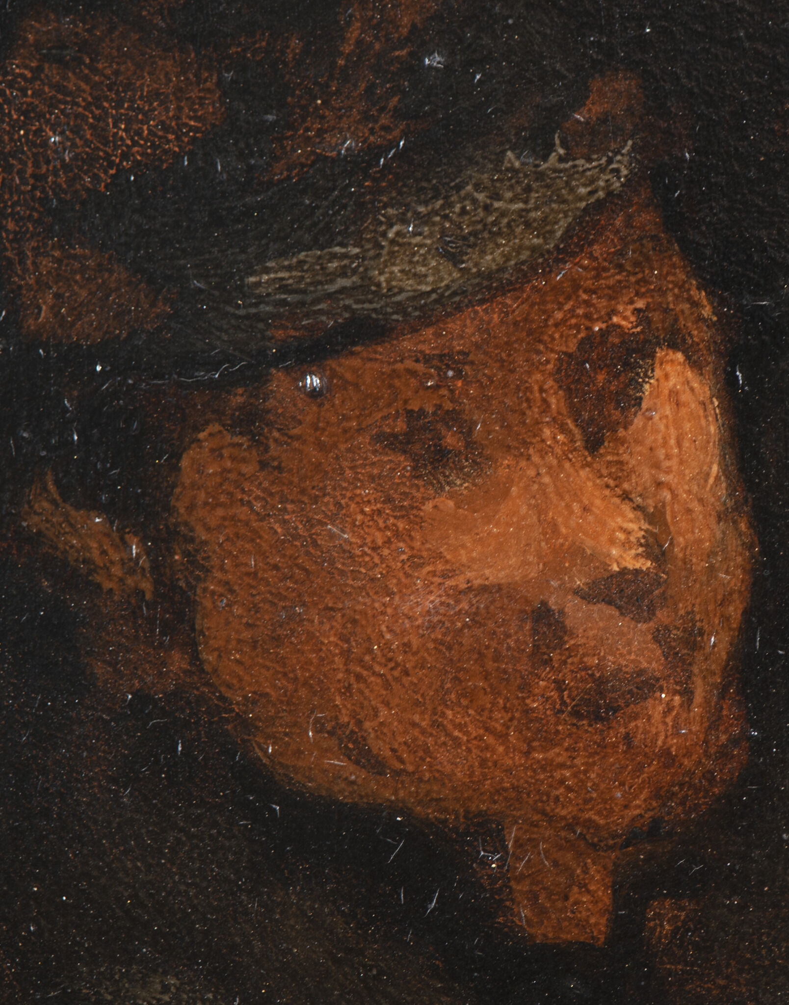 Structure was important to Daumier, and he attempted to render the plastic forms of his compositions’ principal elements through a series of successive thin washeswash: An application of thin paint that has been diluted with solvent. placed over his initial linear designs. He often redrew his original outlines, as other scholars have shown, in materials associated more with drawing than with painting—charcoal, ink, lithographylithography: Invented by Alois Senefelder (German, 1771–1834) in the late eighteenth century, lithography is a planographic printmaking technique. The name (literally: stone drawing) comes from the use of a stone as the printing matrix; however, grained aluminum and metal plates are also used. Preparation and printing of the images is a based on the hydrophobic nature of grease. The design is drawn with greasy crayons or an oily ink called tusche. The stone is then synthesized so that printing can be accomplished by first wetting the stone (the water is repelled by the grease in the media) and then inking the stone with a greasy ink (the ink adheres grease in the crayon and tusche). The image is transferred to the paper with a press that exerts tremendous pressure on the stone. Like other printing techniques the printed image reverses the image on the stone. There is no platemark as seen in monotypes; instead the area of contact between the stone and the paper will have a flatter appearance than the surrounding paper. crayon, or water-based media—in an effort to maintain structural clarity and articulate details within his forms.15See Aviva Burnstock and William Bradford, “An Examination of the Relationship between the Materials and Techniques used for Works on Paper, Canvas, and Panel by Honoré Daumier,” in Painting Techniques: History, Materials and Studio Practice; Contributions to the Dublin Congress, 7–11 September 1998 (London: International Institute for Conservation of Historic and Artistic Works, 1998), 217–22. Although paintings conservator Mary Schafer and Mellon scientist John Twilley did not find such drawing materials in the Nelson-Atkins painting, as confirmed in the accompanying technical essay, they did find evidence of double lines from a quill or reed pen scored into the wet groundground layer: An opaque preparatory layer applied to the support, either commercially or by the artist, to prevent absorption of the paint into the canvas or panel. See also priming layer. around the edge of the central male figure’s cheek, scarf, and top hat (see Technical Entry, Fig. 9).16See the accompanying technical entry by Schafer and Twilley. They also discovered that Daumier used a printmaker’s brayer, or ink roller, in the application of his ground (see Technical Entry, Figs. 7, 8).17See the accompanying technical entry by Schafer and Twilley, as well as Louisa Smieska, John Twilley, Arthur Woll, Mary Schafer, and Aimee Marcereau DeGalan, “Energy-Optimized Synchrotron XRF Mapping of an Obscured Painting Beneath Exit from the Theater, attributed to Honoré Daumier,” Microchemical Journal 146 (May 2019): 679–91, https://doi.org/10.1016/j.microc.2019.01.058. On at least two additional occasions, as Schafer and Twilley have shown, Daumier utilized a brayer in the production of an oil painting, a technique that produced the stipple-like texture revealed by radiographsX-ray radiography (also referred to as x-radiography or radiography): Radiography is an examination tool analogous to the use of X-rays in medicine whereby denser components of a painted composition can be recorded as an inverted shadow image cast on film or a digital X-ray imaging plate from a source such as an X-ray tube. The method has been used for more than a century and is most effective with dense pigments incorporating metallic elements such as lead or zinc. It can reveal artist changes, underlying compositions, and information concerning the artwork’s construction and condition. The resulting image is called an x-radiograph or radiograph. It differs from the uses of X-ray spectrometry in being dependent on the density of the paint to absorb X-rays before they reach the film or image plate and being non-specific as to which elements are responsible for the resulting shadow image..18The two paintings unquestionably by Daumier that also reveal the use of the brayer are The Print Collector (ca. 1857–63; Art Institute of Chicago) and French Theater (ca. 1856; National Gallery of Art, Washington, DC). In the case of the Nelson-Atkins panel, Schafer and Twilley believe that “the texture may have had the additional advantage of reducing the visibility of brushstrokes associated with the discovery of an underlying landscape beneath Exit from the Theater by a different hand” (see their accompanying technical report). As the pigments utilized in the construction of the underlying painting are consistent with the time frame proposed for Exit from the Theater, I have chosen not to deal with it directly in this essay. For more on the underlying painting’s history and process of discovery, see Smieska et al., “Energy-Optimized Synchrotron XRF Mapping.” Due to the built-up layers of oil and varnish used to model Exit from the Theater, this subtle texture within the ground layer is not visible on the painting’s surface, and therefore not likely to be the result of duplication by a forger.