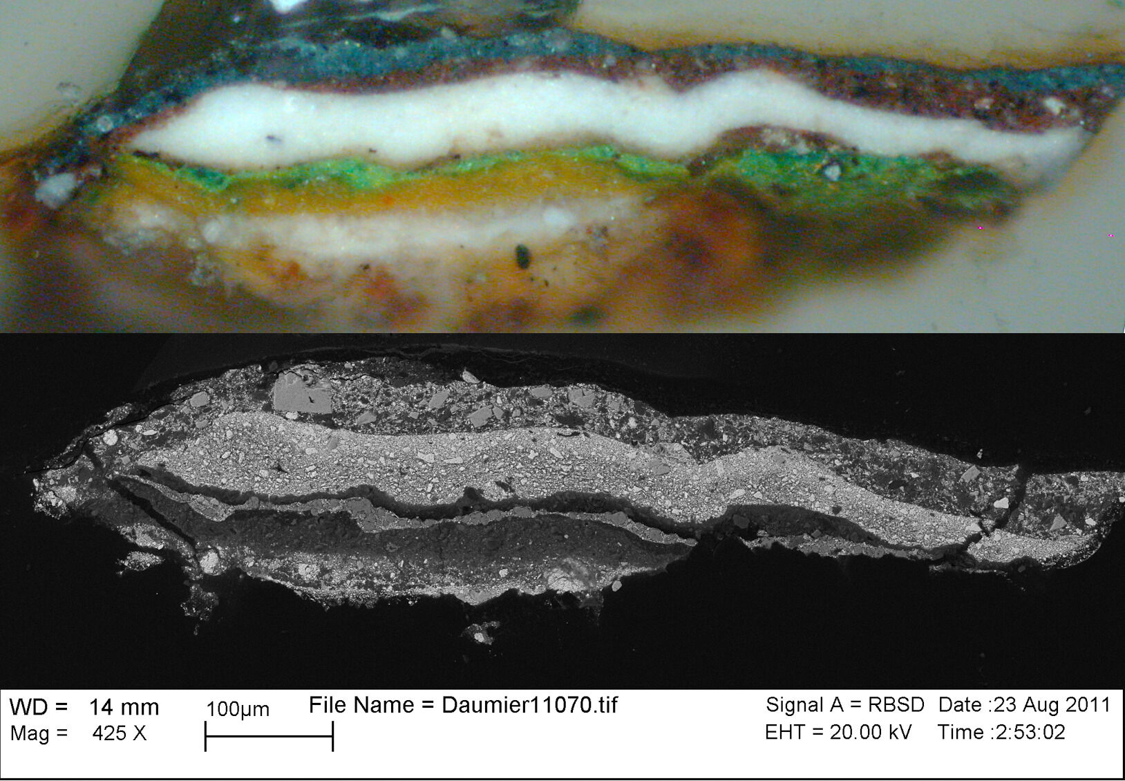 Fig. 19. Paint cross section details of Exit from the Theater (after 1863) in visible and backscatter electron images with the various strata labeled. Scale bar = 0.03mm.