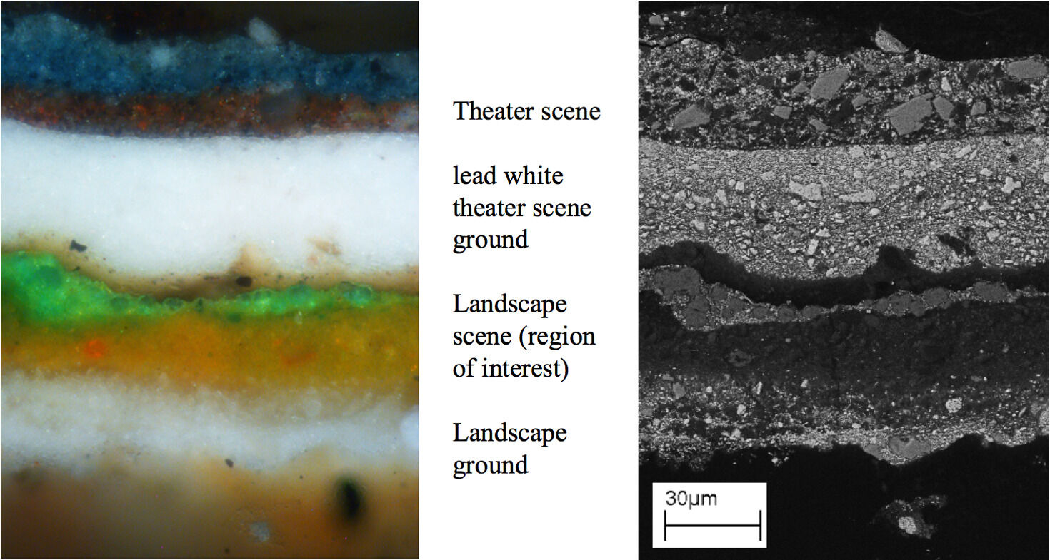 Considering the number of Daumier forgeries and the questions surrounding the Nelson-Atkins painting, it was essential to confirm that the materials used were entirely among those available to Daumier. The reused panel provided yet another level of materials scrutiny since the pigments of the underlying landscape must also have been in use prior to Daumier’s execution of Exit from the Theater if, indeed, he was the artist. While the stippled ground texture connects the Nelson-Atkins painting more securely to authentic works by Daumier, this thick application of lead white was the main impediment to study of the underlying landscape, obscuring details that would otherwise be visible through radiography and infrared reflectography.