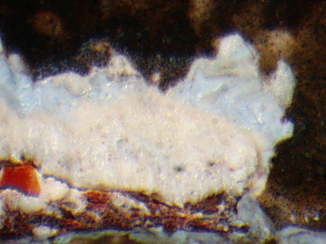 Fig. 20. Photomicrograph of Exit from the Theater (after 1863), showing sky blue paint from the underlying landscape and its ground layer exposed at an edge loss, field of view is approximately 0.5mm