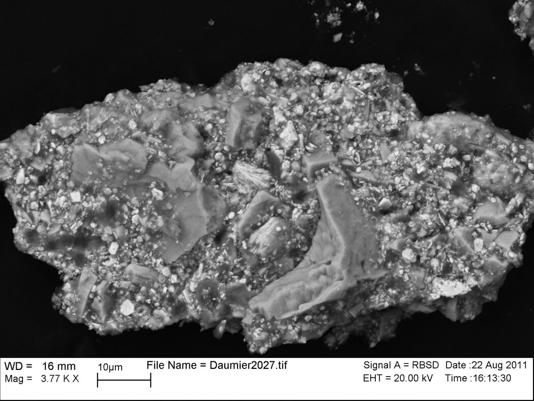 Fig. 21. Jagged particles of coarse natural barite make up most of this sample of flesh color from the mouth of the largest male figure, Exit from the Theater (after 1863). Size and shape differentiate them from synthetic barium sulfate which was also in common use. Smaller particles of lead white and chrome yellow surround the barite. Backscatter electron image, scale bar = 0.01mm.