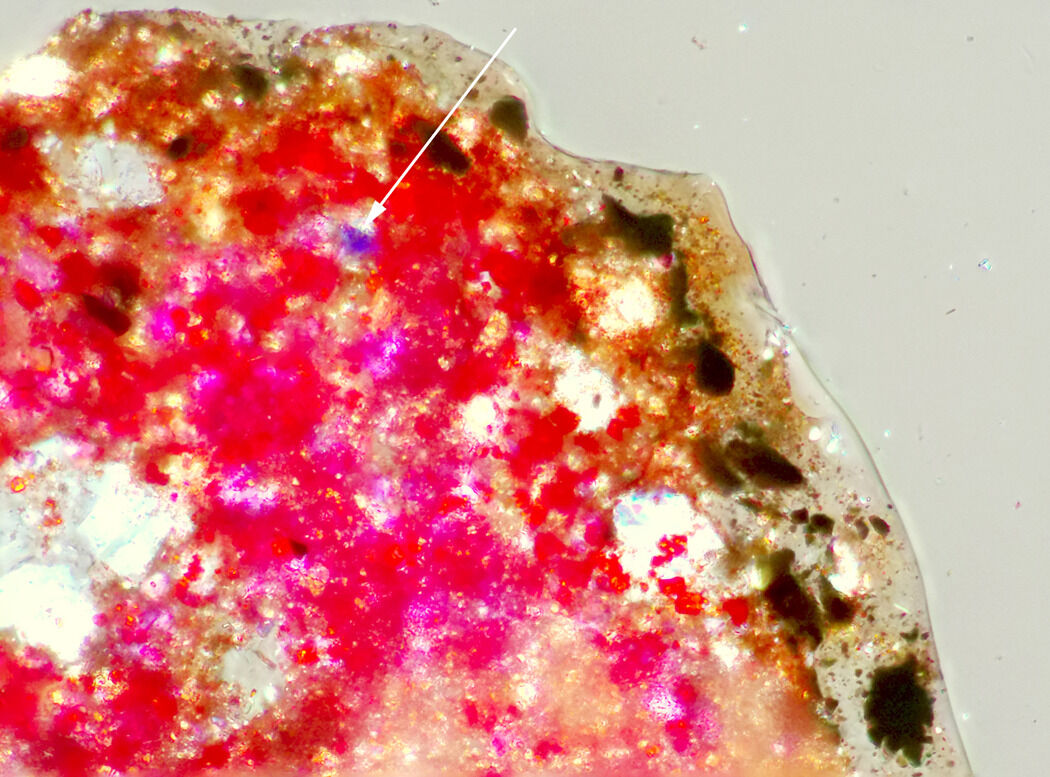 Fig. 22. Red pigments that make up the shadows in the faces of Exit from the Theater (after 1863), including cobalt phosphate violet beneath a semitransparent layer of bone black and iron earth. A single particle of cobalt blue is present at the arrow. Transmitted light with crossed polars, 200x.