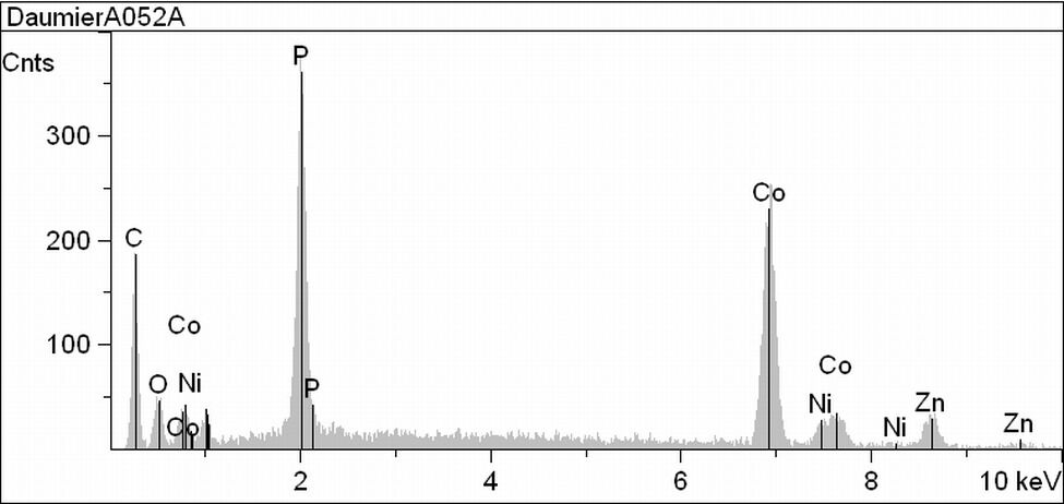 Fig. 23. X-ray spectrum from an individual particle of cobalt violet probed in the SEM showing a small amount of nickel (Ni) detectable along with the elements phosphorus (P), cobalt (Co), and oxygen (O), Exit from the Theater (after 1863)