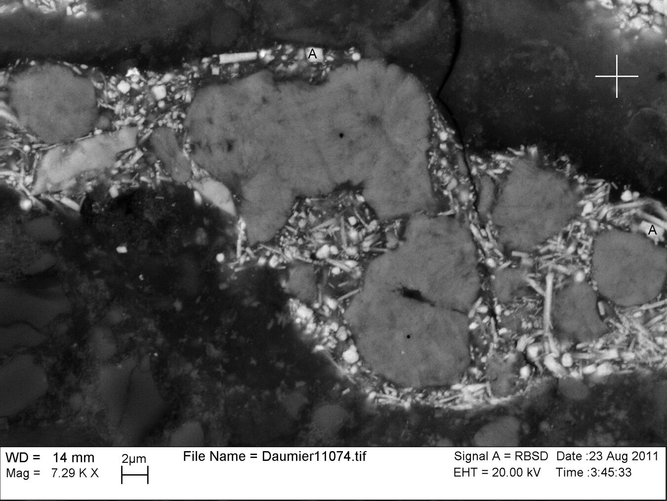 Fig. 24. Cross section detail of Exit from the Theater (after 1863), showing the landscape green layer in Figure 18 with coarse, rounded grains of copper arsenite green surrounded by brighter needles of lead chromate yellow, backscatter electron image, scale bar = 0.002mm
