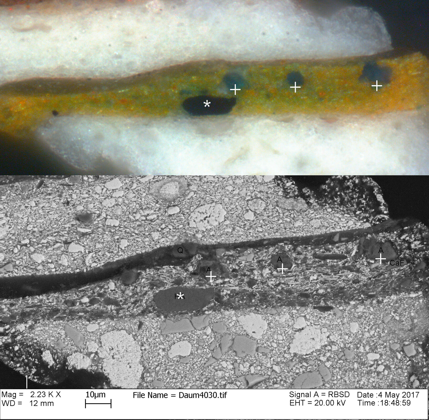 Fig. 25. Cross section detail of Exit from the Theater (after 1863), showing a second landscape yellow-green sample; (top) visible light microscope image and (bottom) backscatter electron image, showing sparse grains of cobalt blue “+” and a single example of bone black “*”, scale bar = 0.010mm