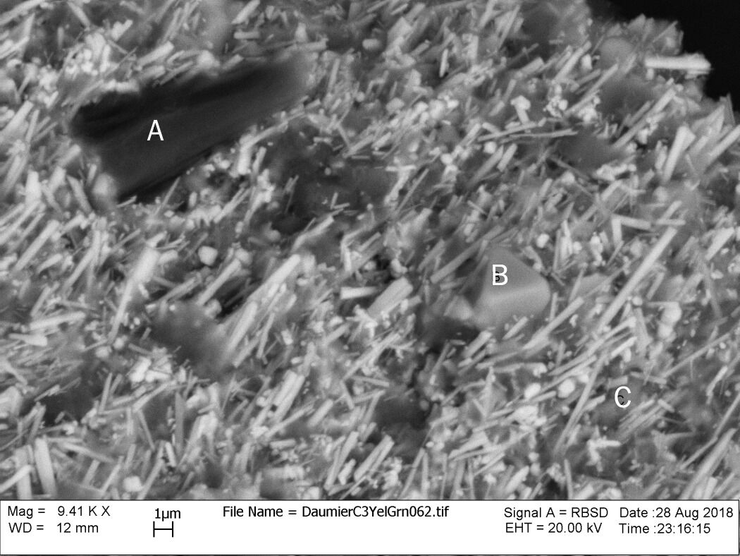 Fig. 26. Microsample beneath the chin of the man on the left corresponding with a tin response from the hills in the mid distance, backscatter electron image, Exit from the Theater (after 1863). Cerulean blue in the form of a blocky hexagon (B), a stray particle of charcoal (A), and an iron earth particle (C) are surrounded by needles of chrome yellow. Scale bar = 0.001mm.