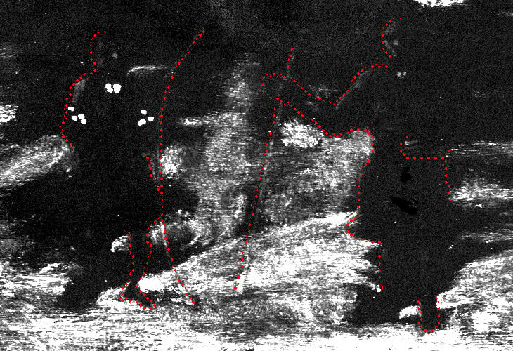 Fig. 29. Annotated detail from the center foreground of the arsenic K map acquired at 12.9 keV in Figure 28 showing figures in silhouette surrounded by arsenic in the foliage green, Exit from the Theater (after 1863)