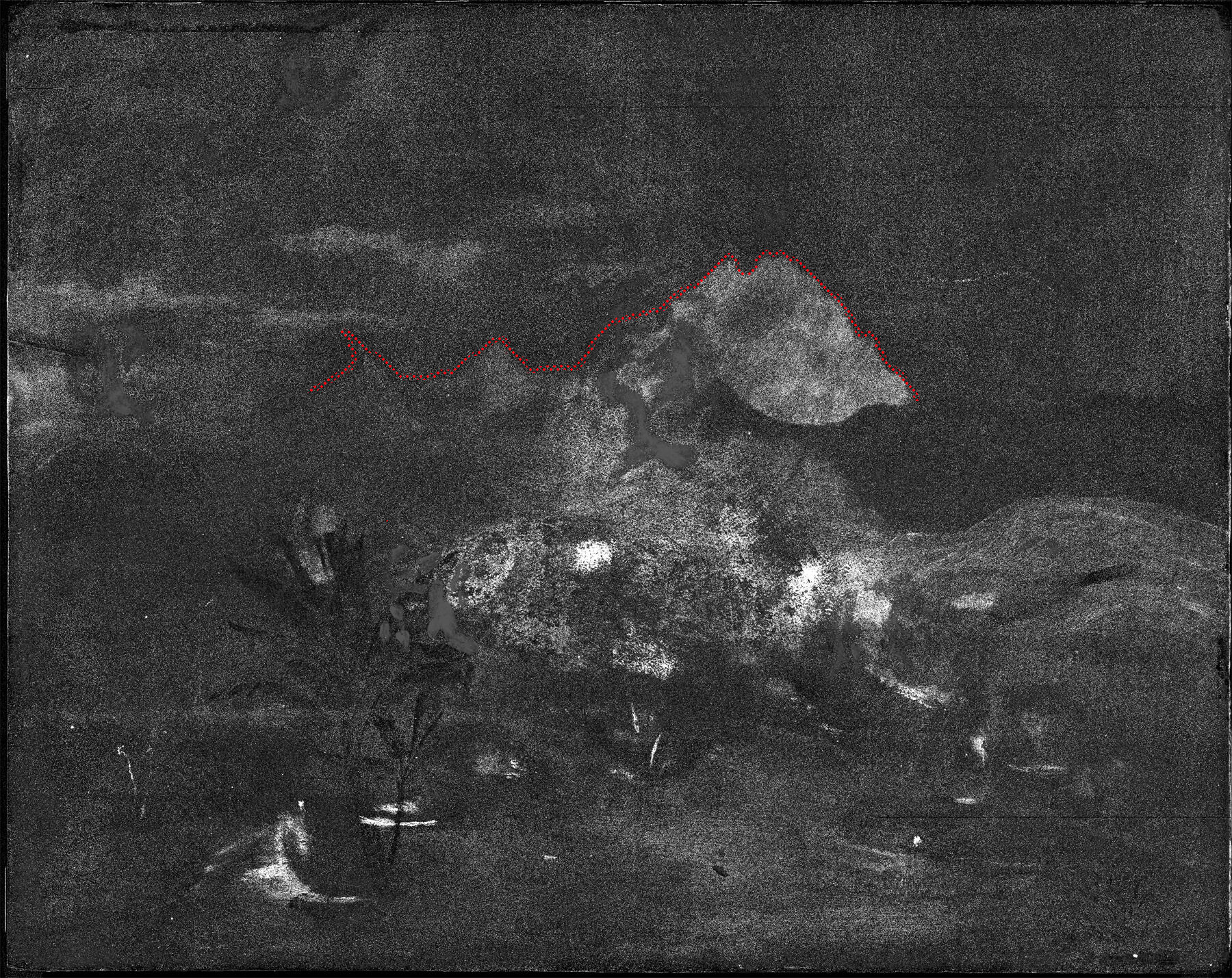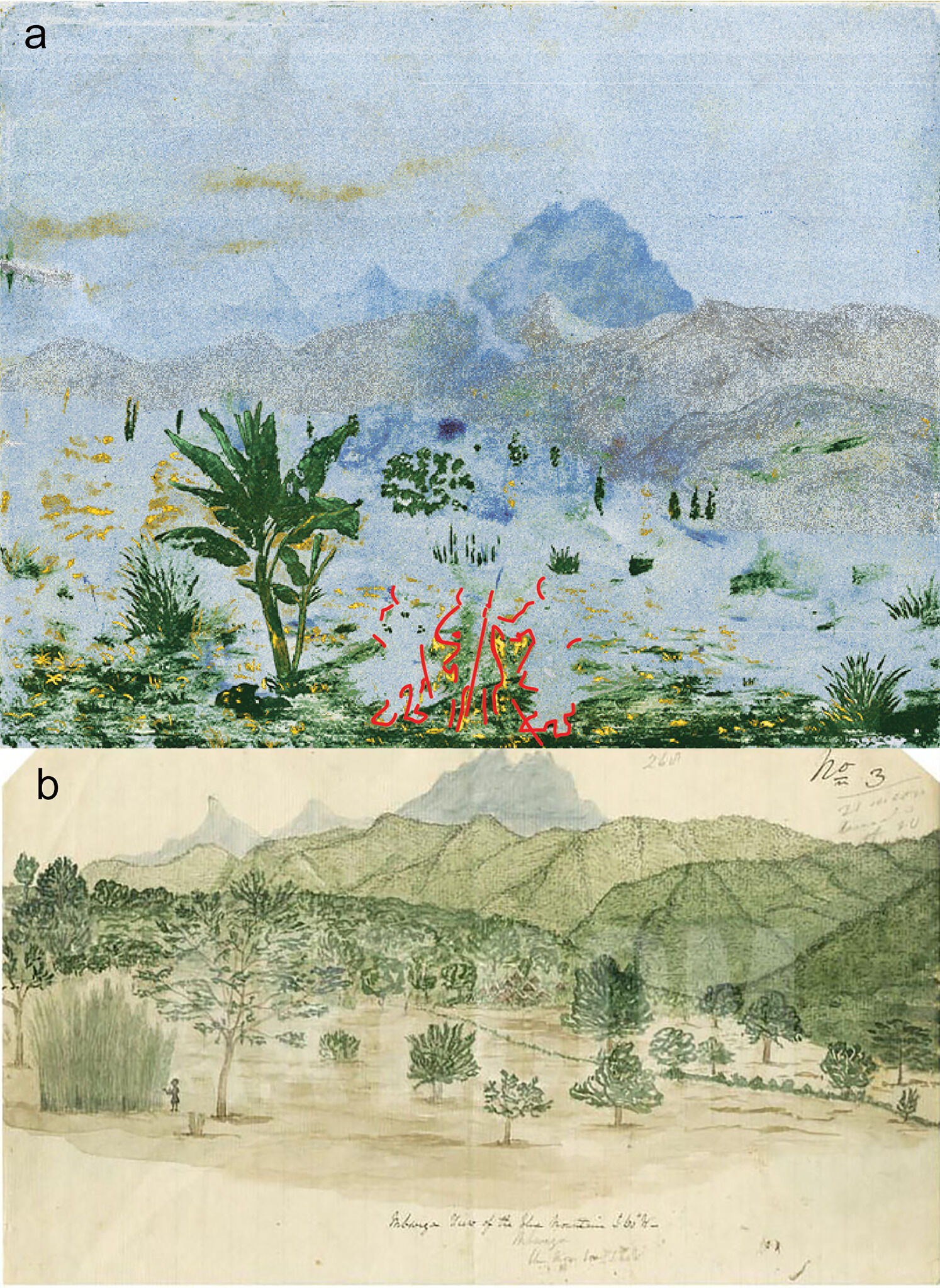Figs. 36a–b. 36a. Overlaid elemental maps of Exit from the Theater (after 1863), revealing an image of the underlying landscape. Courtesy of Louisa Smieska; 36b. John Hanning Speke, Mbwiga, View of the Blue Mountains S 60’W, 1858, watercolor, Royal Geographical Society, S0016604