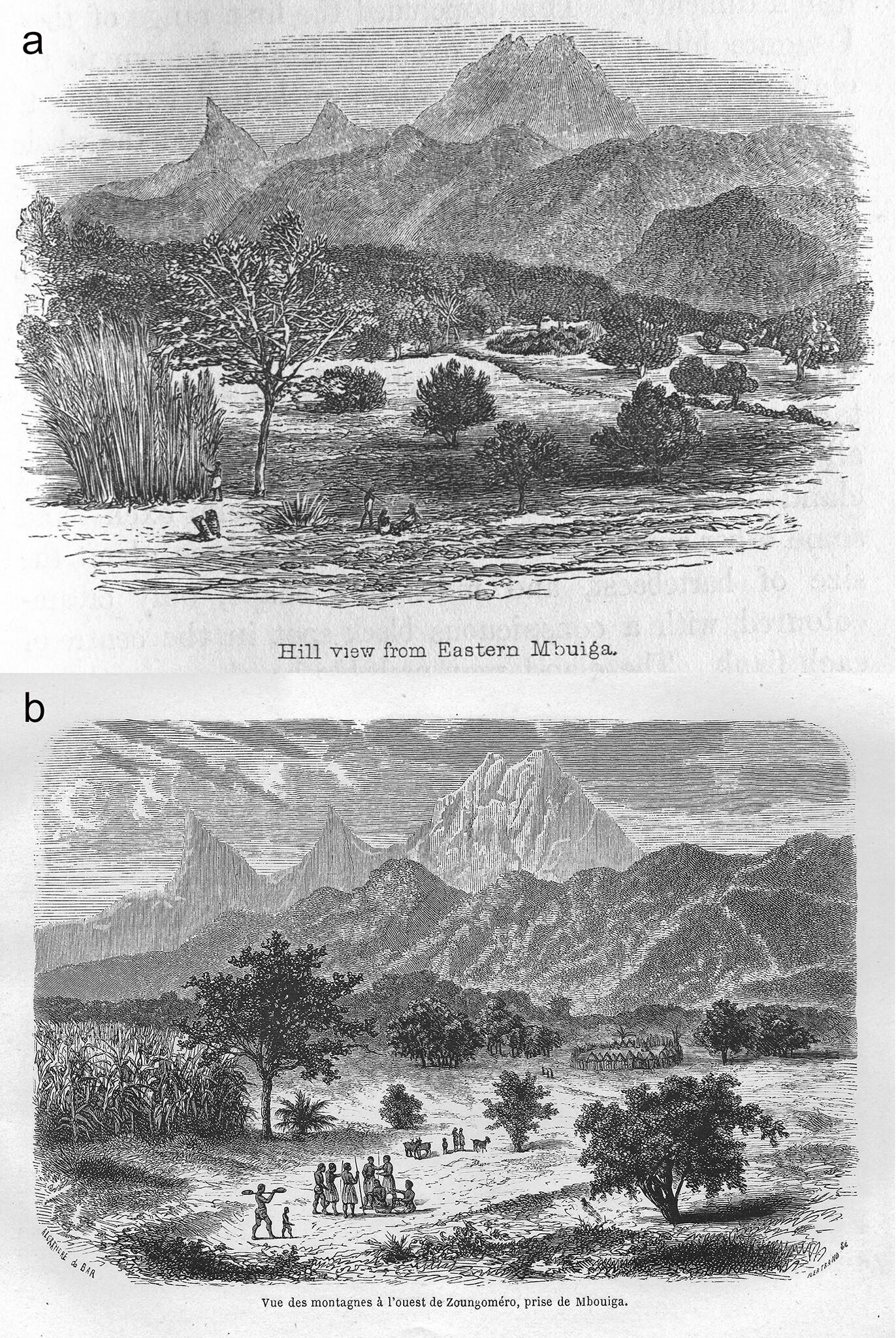 Figs. 37a–b. 37a. Hill View from Eastern Mbûiga, engraving from Speke, Journal of the Discovery of the Source of the Nile (Edinburgh and London: Blackwood, 1863), 45; 37b. Vue des montagnes á l’ouest de Zoungoméro, prise de Mbouiga, engraving from Speke, Journal of the Discovery of the Source of the Nile (Paris: Hachette, 1864), 59