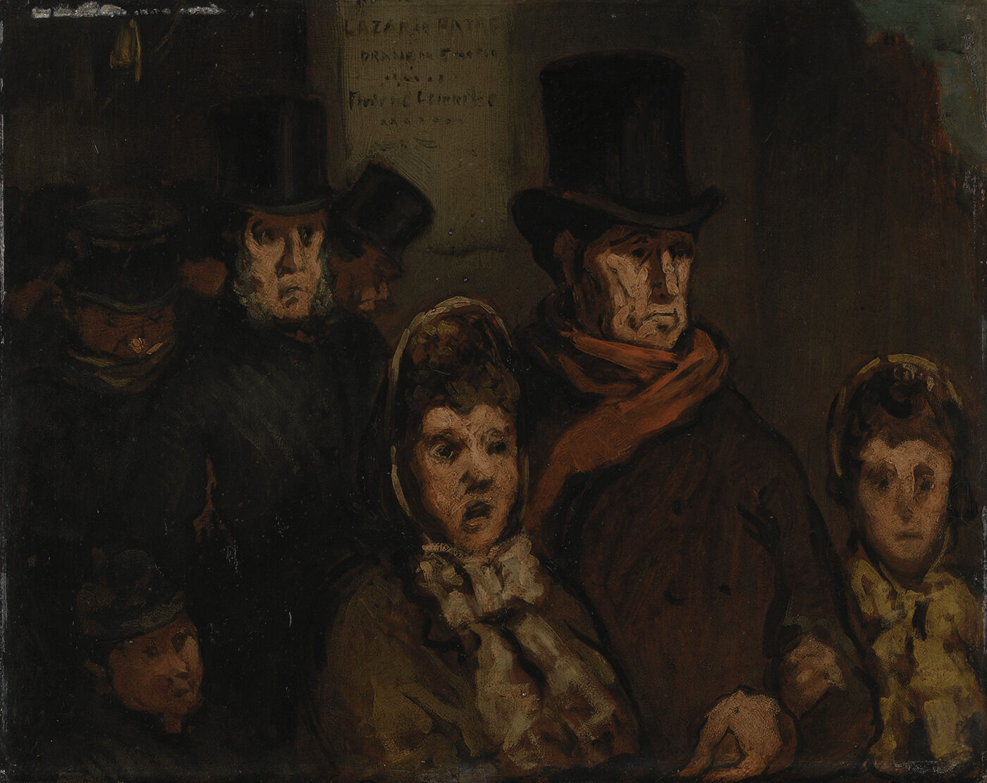 Honoré Daumier, Leaving the Theater, ca. 1865, oil on canvas, 13 1/8 in. x 16 1/4 in. (33.3 x 41.3 cm), San Diego Museum of Art.