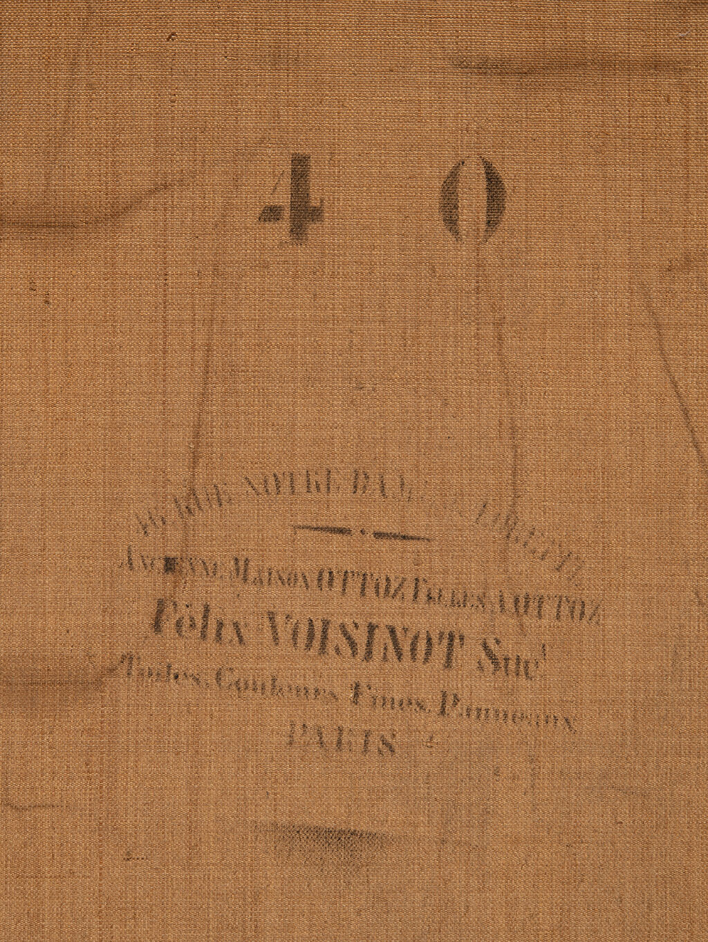 Although faint in areas, the stamp on the canvas reverse reads “46, RUE NOTRE DA[ME de] LORET[TE] / ANCIENNE MAISON OTTOZ FRERES A OTTOZ / Félix VOISINOT Suc.r / Toiles, Couleurs Fines, Panneaux. / PARIS”