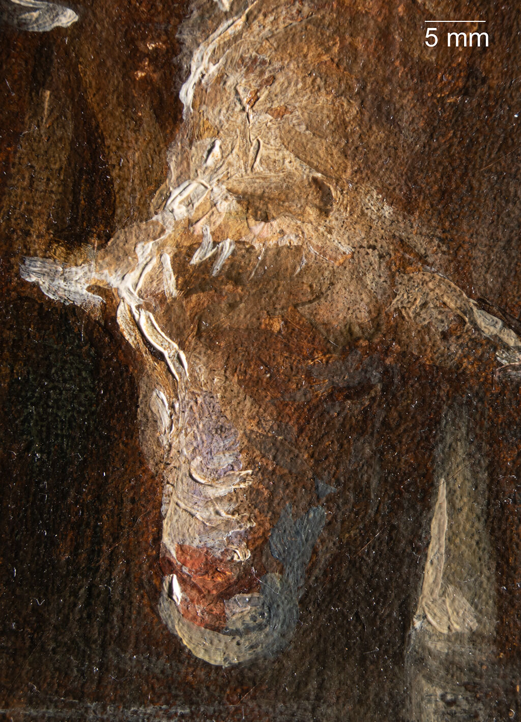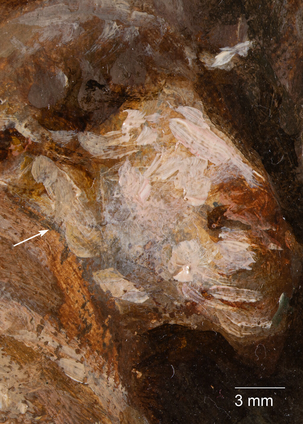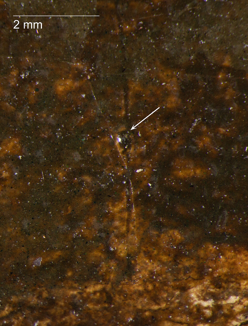 Fig. 11. Photomicrograph of Sheep at the Watering Hole (ca. 1888), showing a pinhole and incised line, both of which are covered by brown paint