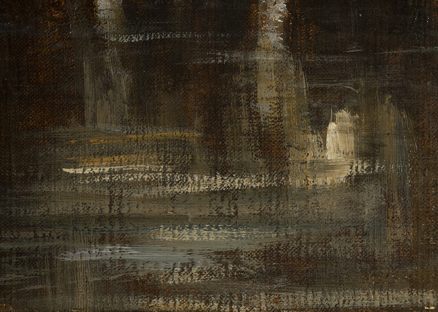 The unlined canvas has become weak and brittle over time, and in addition to mild canvas distortions along the top edge, small splits in the canvas have formed at the turnover edgeturnover edge: The point at which the canvas begins to wrap around the stretcher, at the junction between the picture plane and tacking margin. See also foldover edge.. A mildly cupped craquelurecraquelure: The network or pattern of cracks that develop on a paint surface as it ages. has developed across the paint surface, and diagonal cracks at the corners result from the tension of the stretched canvas. In 1989, the painting was cleaned to remove a discolored natural resin varnish, and a synthetic varnish was brush-applied.6Forrest Bailey, August 29, 1989, treatment report, NAMA conservation file, 31-88. While this surface coating continues to saturate the paint colors, it has become discolored over time. A small amount of retouchingretouching: Paint application by a conservator or restorer to cover losses and unify the original composition. Retouching is an aspect of conservation treatment that is aesthetic in nature and that differs from more limited procedures undertaken solely to stabilize original material. Sometimes referred to as inpainting or retouch. is present on the outermost edges.