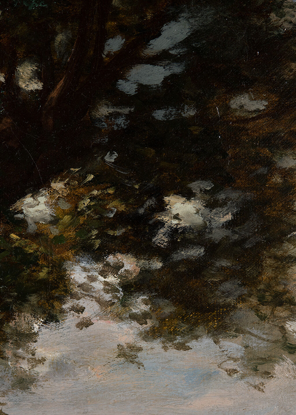 Fig. 9. Detail of the lower portion of the central tree, Sheep at the Watering Hole (ca. 1888), showing dabs of blue-gray overlapping the brown paint of the branches, with finely painted leaves rendered on top of passages of sky