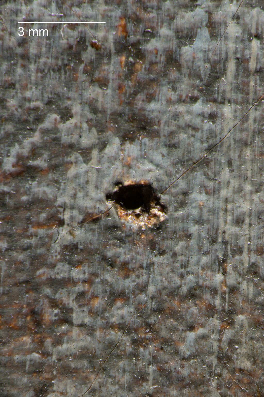 Fig. 10. Photomicrograph in raking illumination, showing a small tack hole at the bottom right corner of Sheep at the Watering Hole (ca. 1888)