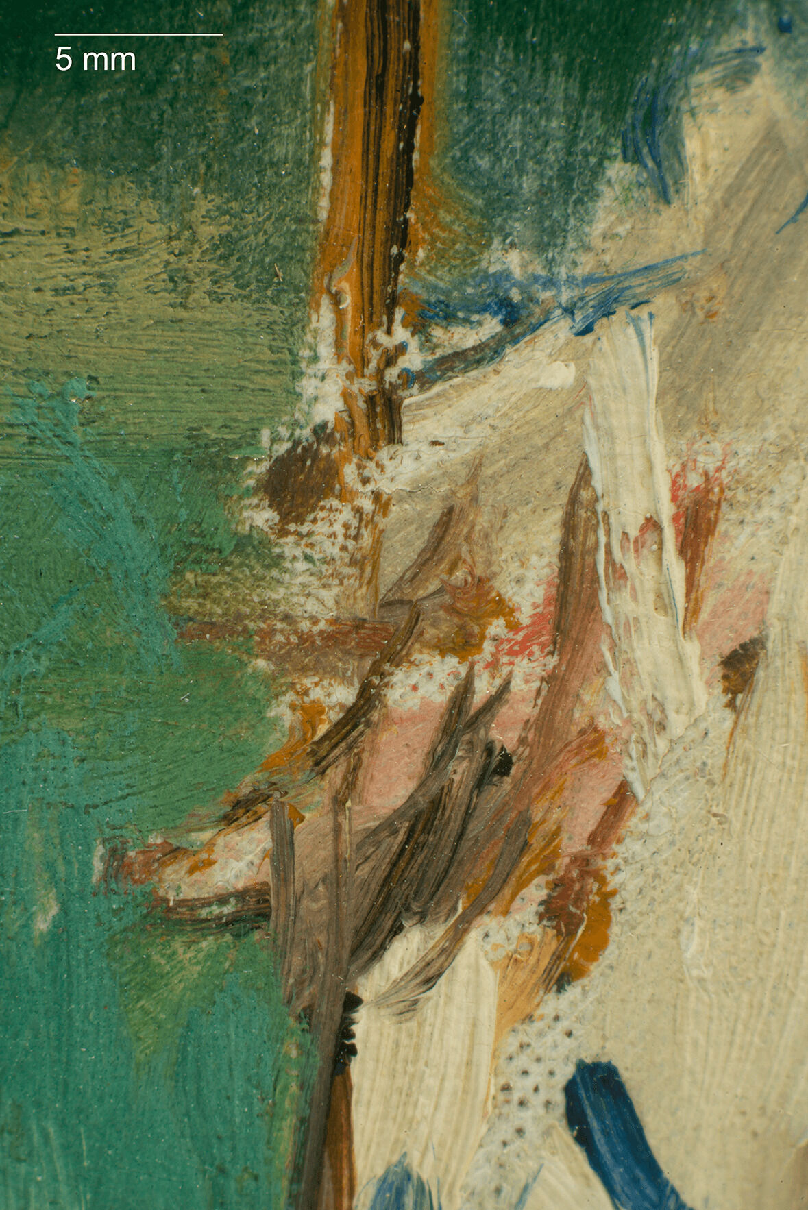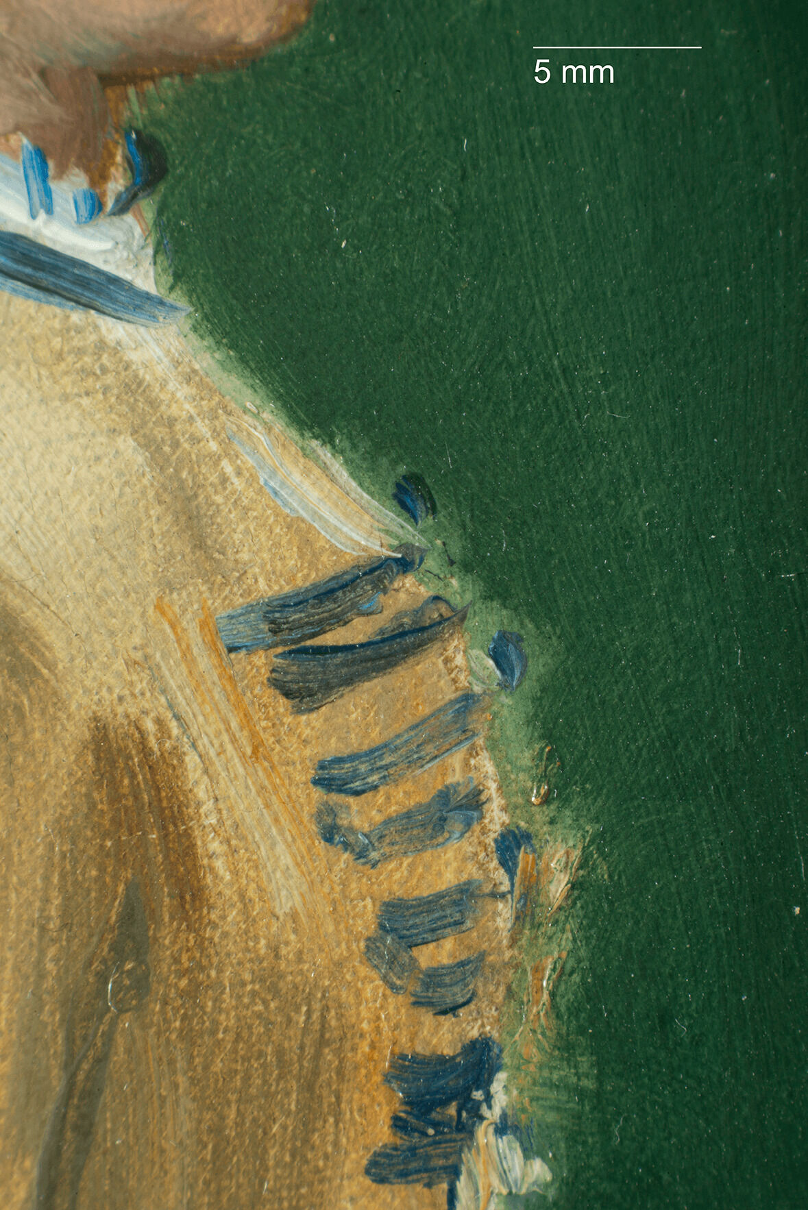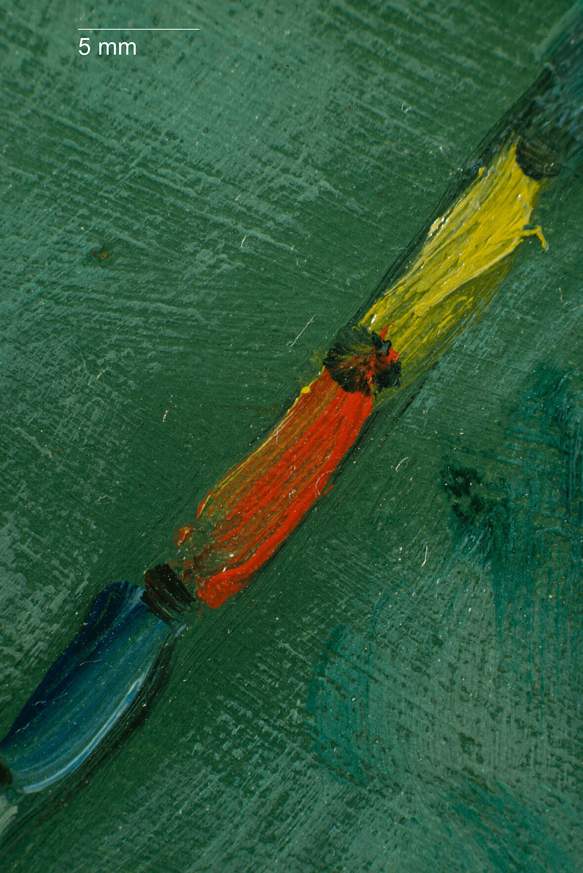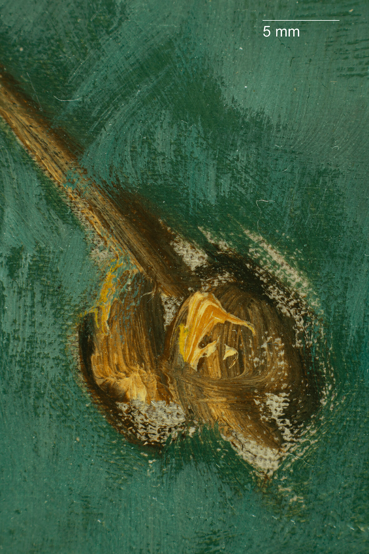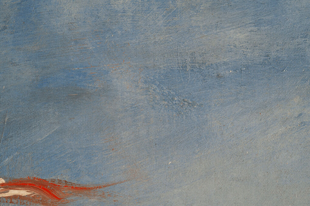 The Croquet Party was completed on a plain weaveplain weave: A basic textile weave in which one weft thread alternates over and under the warp threads. Often this structure consists of one thread in each direction, but threads can be doubled (basket weave) or tripled to create more complex plain weave. Plain weave is sometimes called tabby weave. canvas of nonstandard sizestandard-format supports: Commercially prepared supports available through art suppliers, which gained popularity in the nineteenth century during the industrialization of art materials. Available in three formats figure (portrait), paysage (landscape), and marine (marine), these were numbered 1 through 120 to indicate their size. For each numbered size, marine and paysage had two options available: a larger format (haute) and smaller (basse) format., with the nearest size being a no. 20 marine.1David Bomford, Jo Kirby, John Leighton, and Ashok Roy, Art in the Making: Impressionism (London: Yale University Press, 1991), 45–46. The Croquet Party measures 73.2 x 45.9 cm, while no. 20 marine size measured 73 x 50 cm from Bourgeois and 72.9 x 48.6 cm from Lefranc & Company. The original tacking marginstacking margins: The outer edges of canvas that wrap around and are attached to the stretcher or strainer with tacks or staples. See also tacking edge. remain intact, with one set of tack holes on each margin, spaced approximately two centimeters apart, and with minor cuspingcusping: A scalloped pattern along the canvas edges that relates to how the canvas was stretched. Primary cusping reveals where tacks secured the canvas to the support while the ground layer was applied. Secondary cusping can form when a pre-primed canvas is re-stretched by the artist prior to painting. visible on all four tacking margins.2Due to how minor the cusping appears, it is likely secondary cusping caused by the stretching onto the original stretcher (no longer extant) and not due to sizing and ground application. The ground layerground layer: An opaque preparatory layer applied to the support, either commercially or by the artist, to prevent absorption of the paint into the canvas or panel. See also priming layer. is white, smooth, and even in application. It is thinly applied, extending to the edges of the tacking margins, indicating that it was commercially primed.3Estimated single layer; no samples were taken.