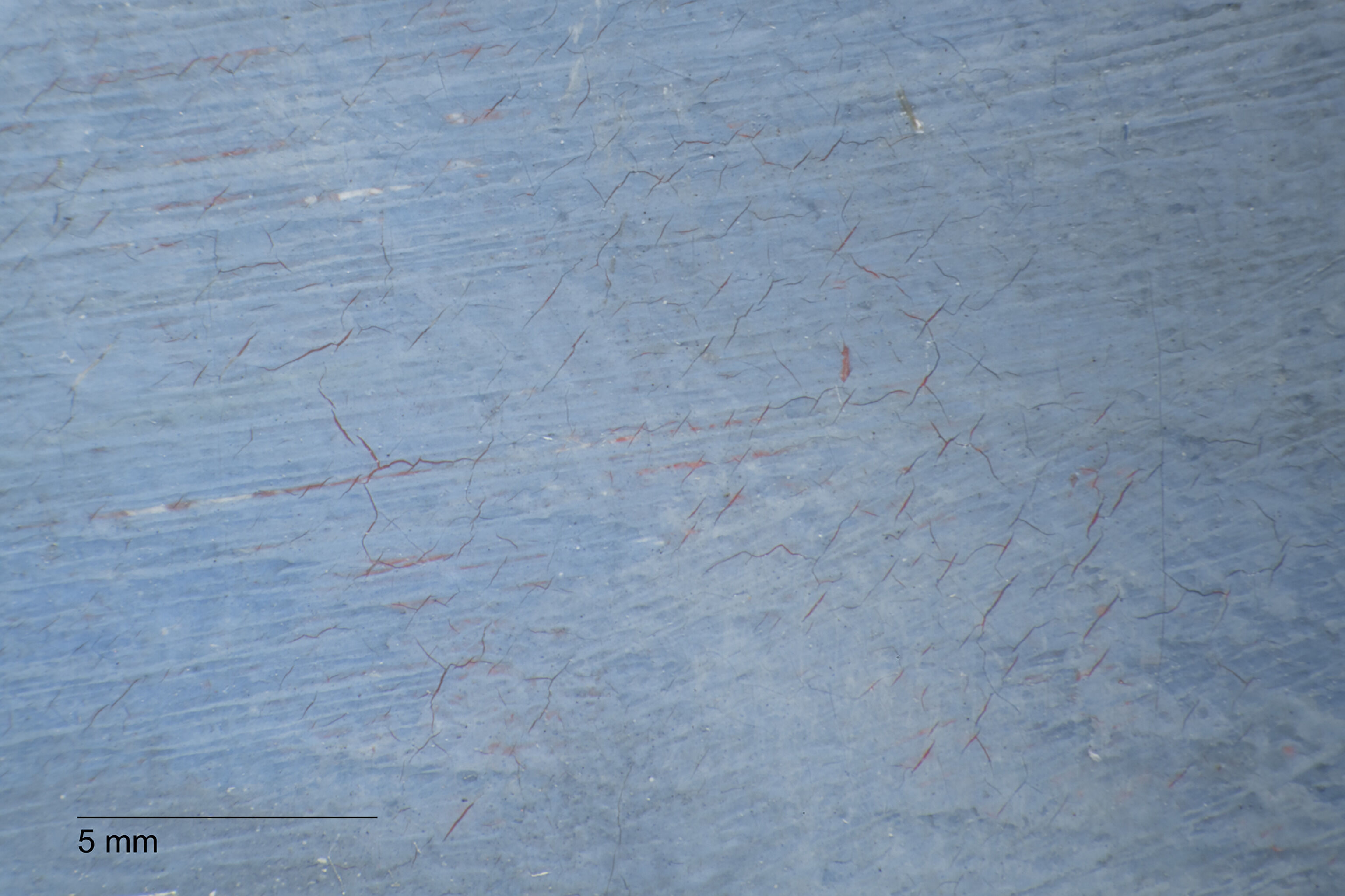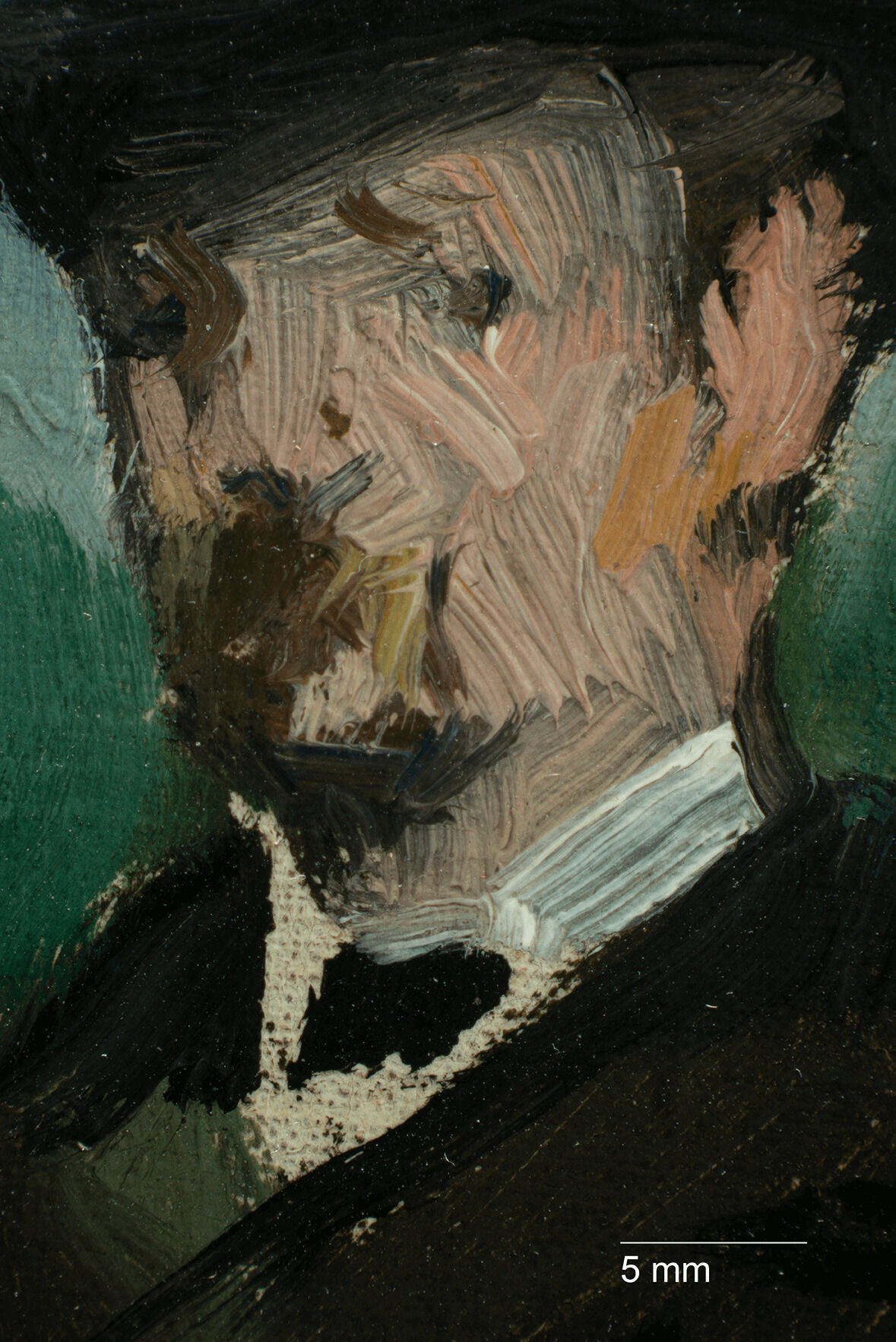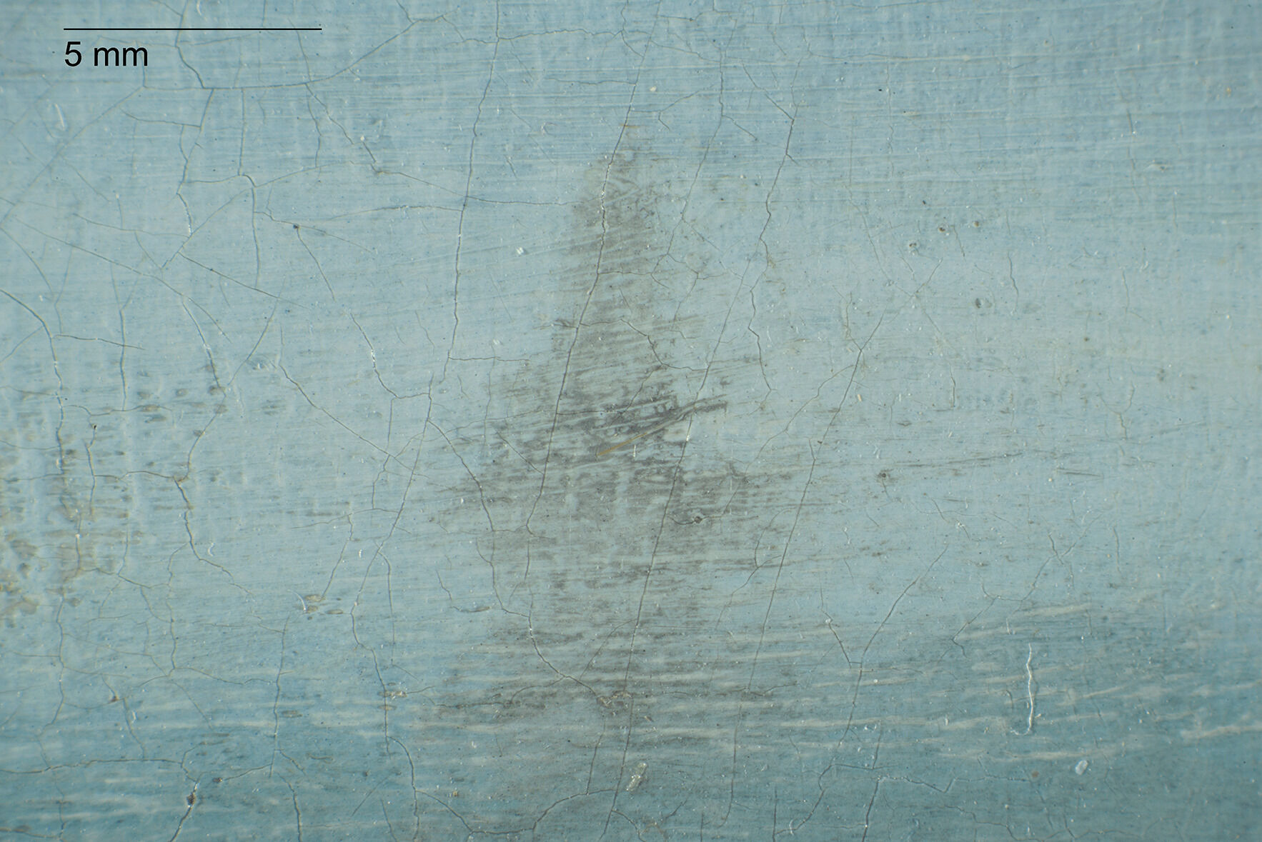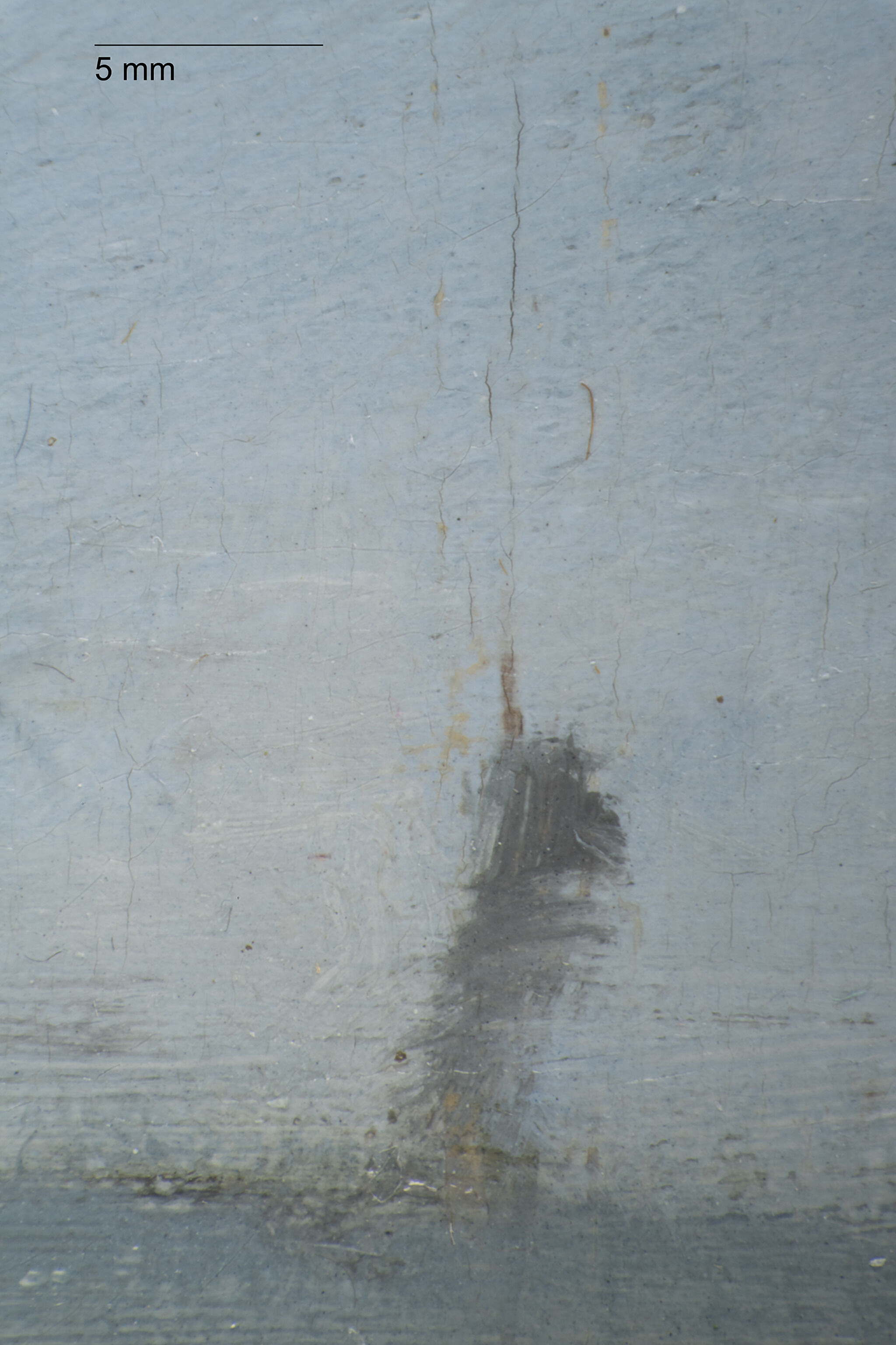 The Croquet Party was completed on a plain weaveplain weave: A basic textile weave in which one weft thread alternates over and under the warp threads. Often this structure consists of one thread in each direction, but threads can be doubled (basket weave) or tripled to create more complex plain weave. Plain weave is sometimes called tabby weave. canvas of nonstandard sizestandard-format supports: Commercially prepared supports available through art suppliers, which gained popularity in the nineteenth century during the industrialization of art materials. Available in three formats figure (portrait), paysage (landscape), and marine (marine), these were numbered 1 through 120 to indicate their size. For each numbered size, marine and paysage had two options available: a larger format (haute) and smaller (basse) format., with the nearest size being a no. 20 marine.1David Bomford, Jo Kirby, John Leighton, and Ashok Roy, Art in the Making: Impressionism (London: Yale University Press, 1991), 45–46. The Croquet Party measures 73.2 x 45.9 cm, while no. 20 marine size measured 73 x 50 cm from Bourgeois and 72.9 x 48.6 cm from Lefranc & Company. The original tacking marginstacking margins: The outer edges of canvas that wrap around and are attached to the stretcher or strainer with tacks or staples. See also tacking edge. remain intact, with one set of tack holes on each margin, spaced approximately two centimeters apart, and with minor cuspingcusping: A scalloped pattern along the canvas edges that relates to how the canvas was stretched. Primary cusping reveals where tacks secured the canvas to the support while the ground layer was applied. Secondary cusping can form when a pre-primed canvas is re-stretched by the artist prior to painting. visible on all four tacking margins.2Due to how minor the cusping appears, it is likely secondary cusping caused by the stretching onto the original stretcher (no longer extant) and not due to sizing and ground application. The ground layerground layer: An opaque preparatory layer applied to the support, either commercially or by the artist, to prevent absorption of the paint into the canvas or panel. See also priming layer. is white, smooth, and even in application. It is thinly applied, extending to the edges of the tacking margins, indicating that it was commercially primed.3Estimated single layer; no samples were taken.