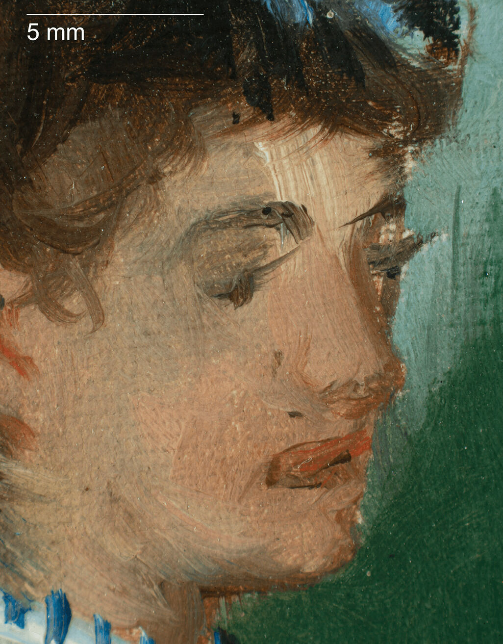In a pastel portrait of Jeanne by Eva Gonzales from 1869–1870 (private collection), she appears with darker hair, in line with her Spanish ancestry. Manet may have therefore taken some license with her hair shade.