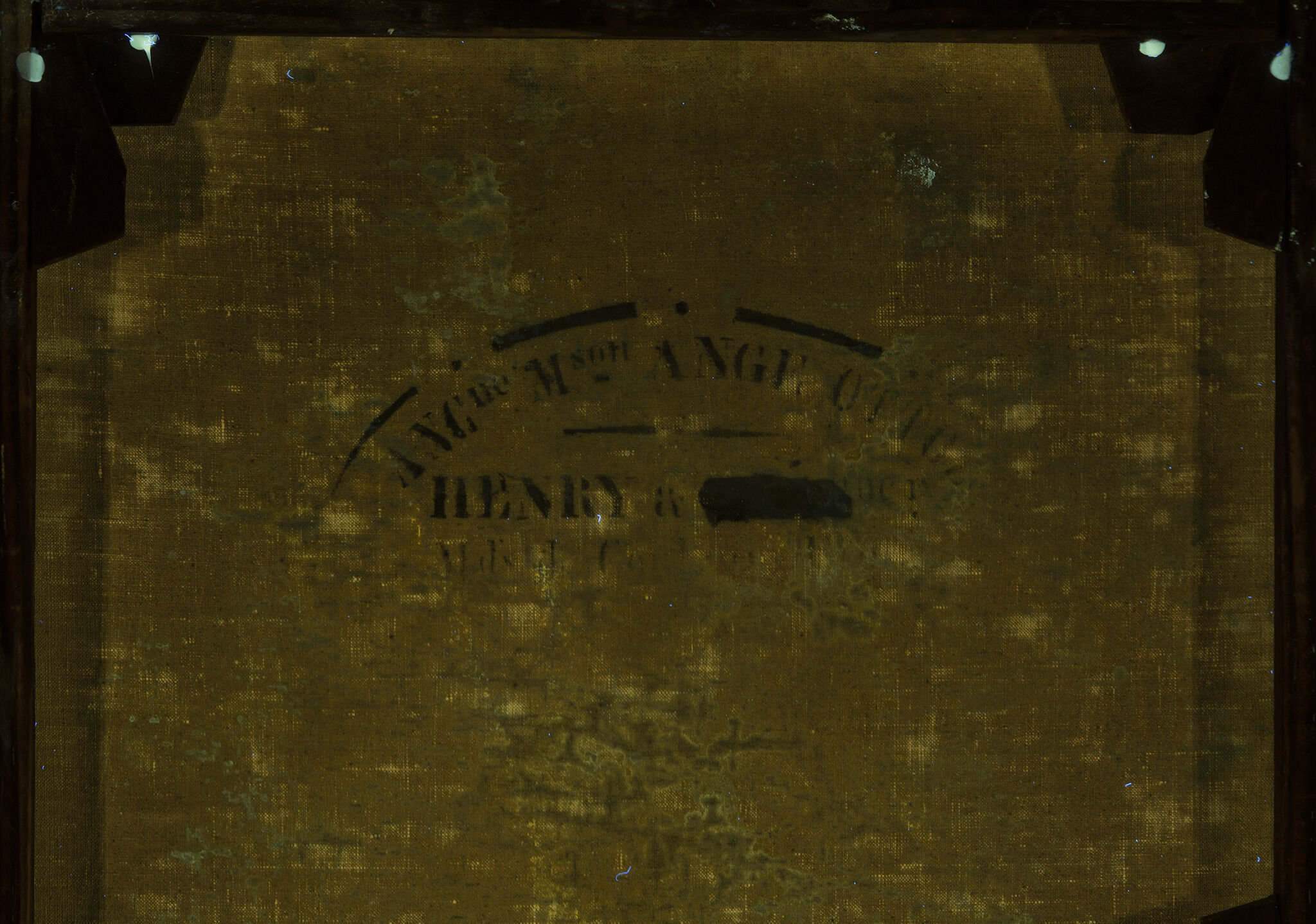 This unlined painting is in excellent condition. Before entering the Nelson-Atkins collection, the painting’s edges were strip linedstrip lining: A conservation technique used to strengthen/repair tacking margins that have weakened or failed. New fabric is adhered to the painting’s damaged tacking margins to allow the stretcher to exert its normal tensioning on the original canvas. to support the weakened tacking margins. A synthetic varnish is present and is in good condition. A minimal amount of retouchingretouching: Paint application by a conservator or restorer to cover losses and unify the original composition. Retouching is an aspect of conservation treatment that is aesthetic in nature and that differs from more limited procedures undertaken solely to stabilize original material. Sometimes referred to as inpainting or retouch. was identified along the edges of the picture plane.