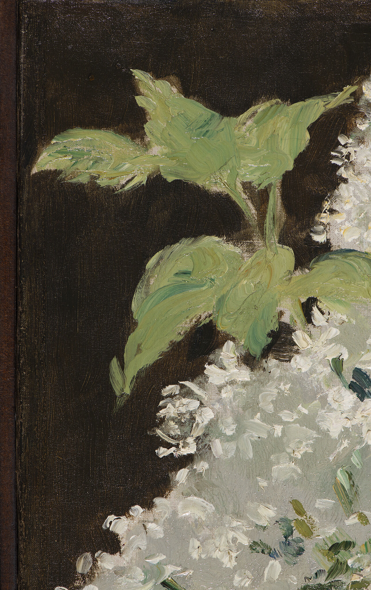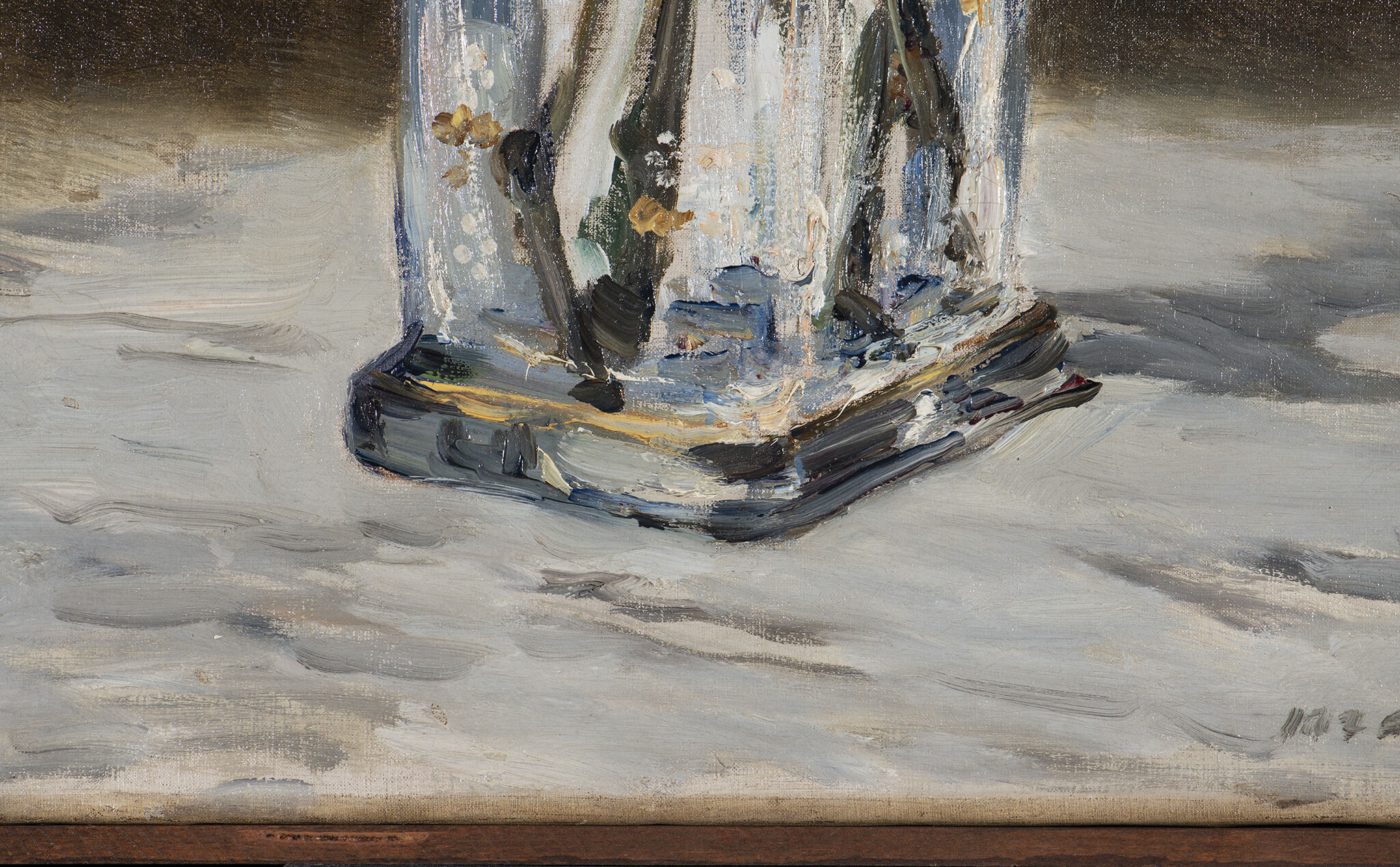 Fig. 7. Detail of the lower edge on White Lilacs in a Crystal Vase (ca. 1882), illustrating the exposed ground at bottom with white paint above