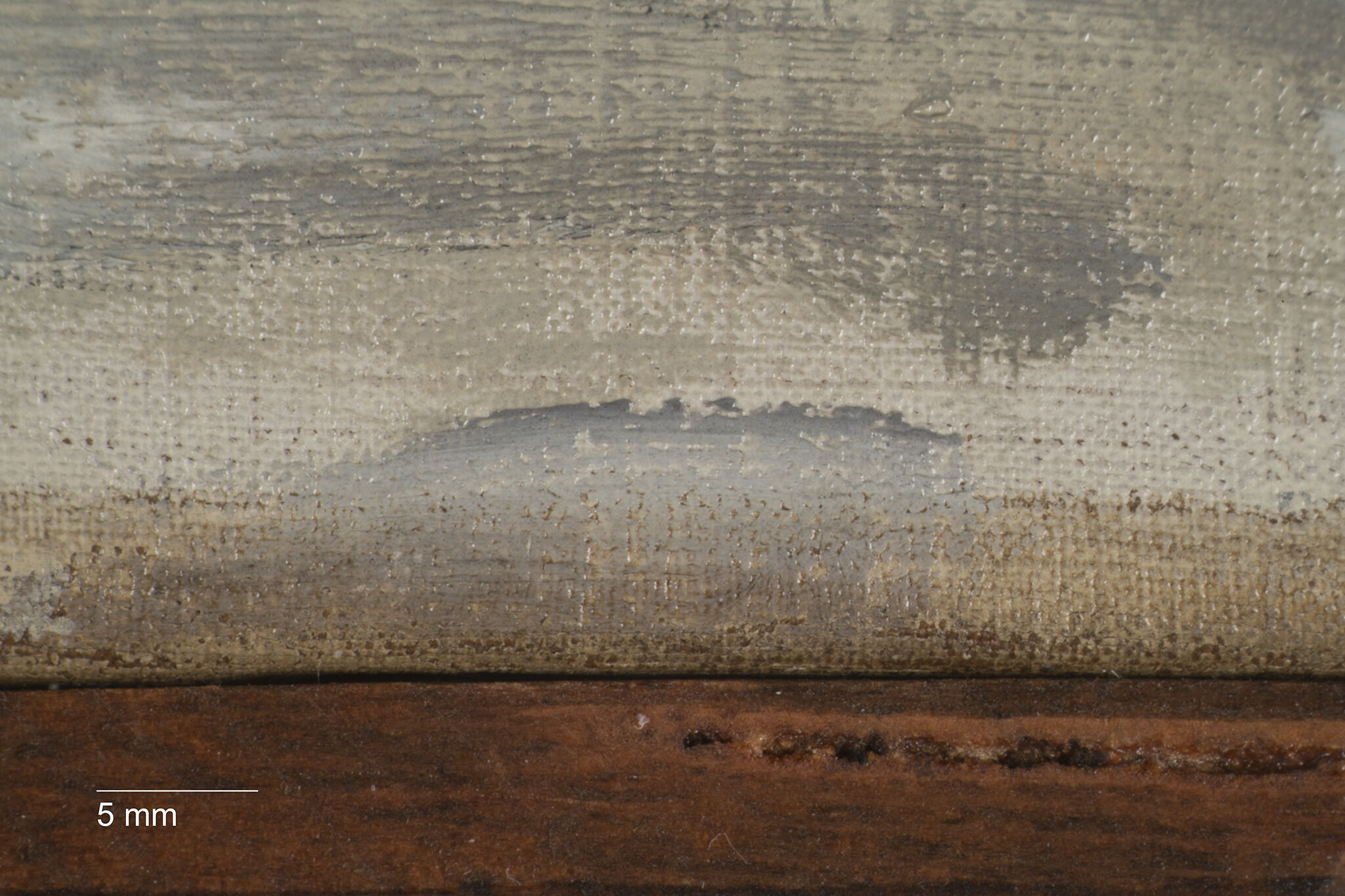 This second ground layer was found along the top right corner at the turnover edge, confirming that it is a layer which extends across the entire picture plane.