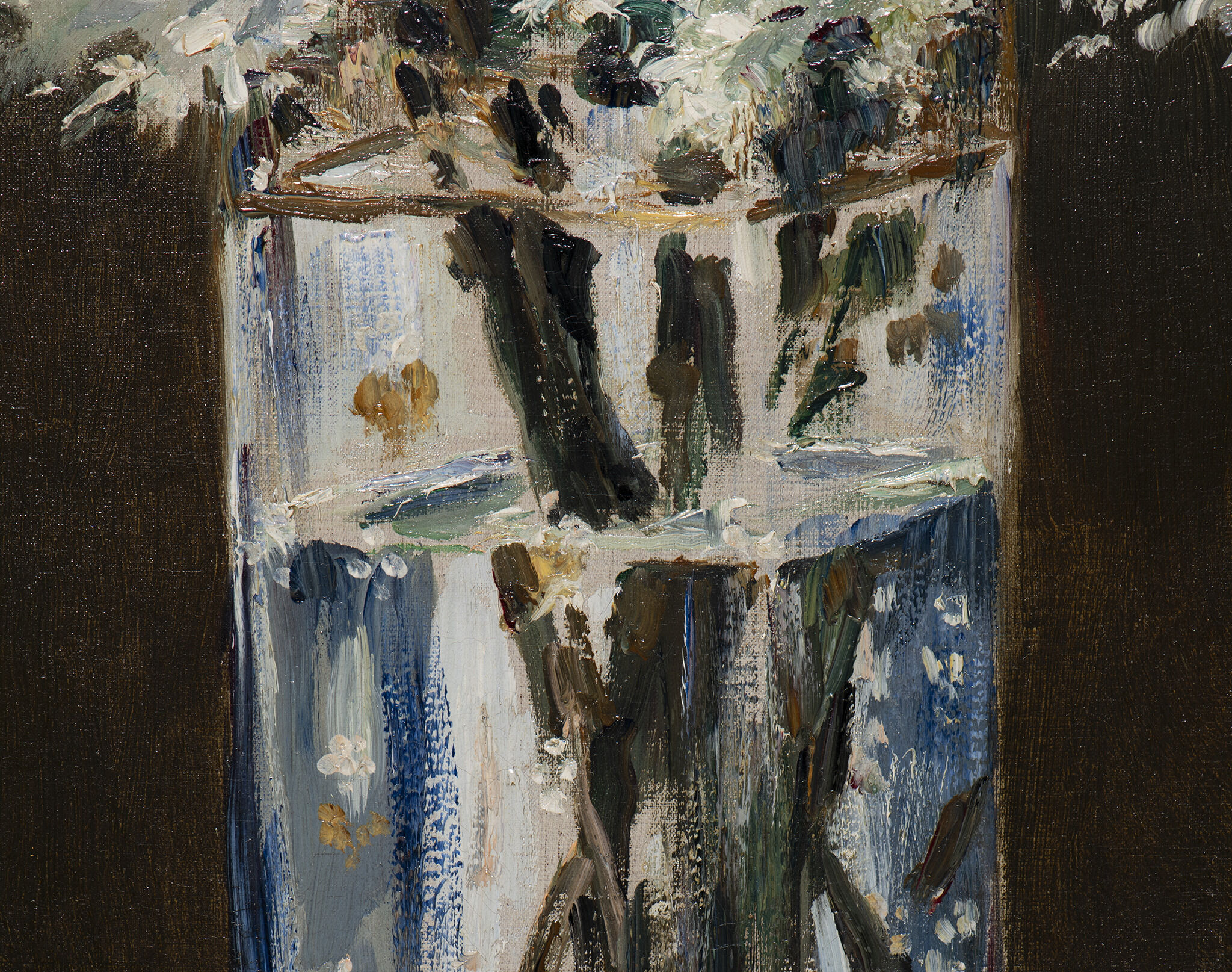 Edouard Manet presents a lively flower arrangement before a dark brown background. Tendrils of white, gray, and green blooms stand, stretch, and spill out of a rectilinear glass. Olive-colored leaves poke out from behind the flowers like plumes from a hat, filling the top half of the canvas with a symmetrical bouquet. Below the blossoms, against the stark surroundings, sketchy strokes of blue, brown, white, and gold form a slender vase, fine details on the surface of the crystal, leggy stems, and refracted reflections in the water. White Lilacs is one of at least twenty tightly cropped still lifes that Manet painted in the last two years of his life. These works represent posies that the convalescent artist received from loved ones during an ultimately fatal bout of illness, and they comprise most of his artistic production in those final months of his life.1For more on Manet’s late work, including his watercolors, see Carol Armstrong’s essay, “Manet’s Little Nothings,” in Scott Allan, Emily A. Beeny, and Gloria Groom, eds., Manet and Modern Beauty: The Artist’s Late Years, exh. cat. (Los Angeles: J. Paul Getty Museum, 2019), 113–28. He had been suffering from complications of syphilis and died on April 30, 1883, a few days after the amputation of one of his legs. As Manet’s mobility grew progressively limited throughout this period, smaller-scale subjects were more manageable. These floral gifts provided him with lightweight, portable “models” that held their pose, if only for a day or so.