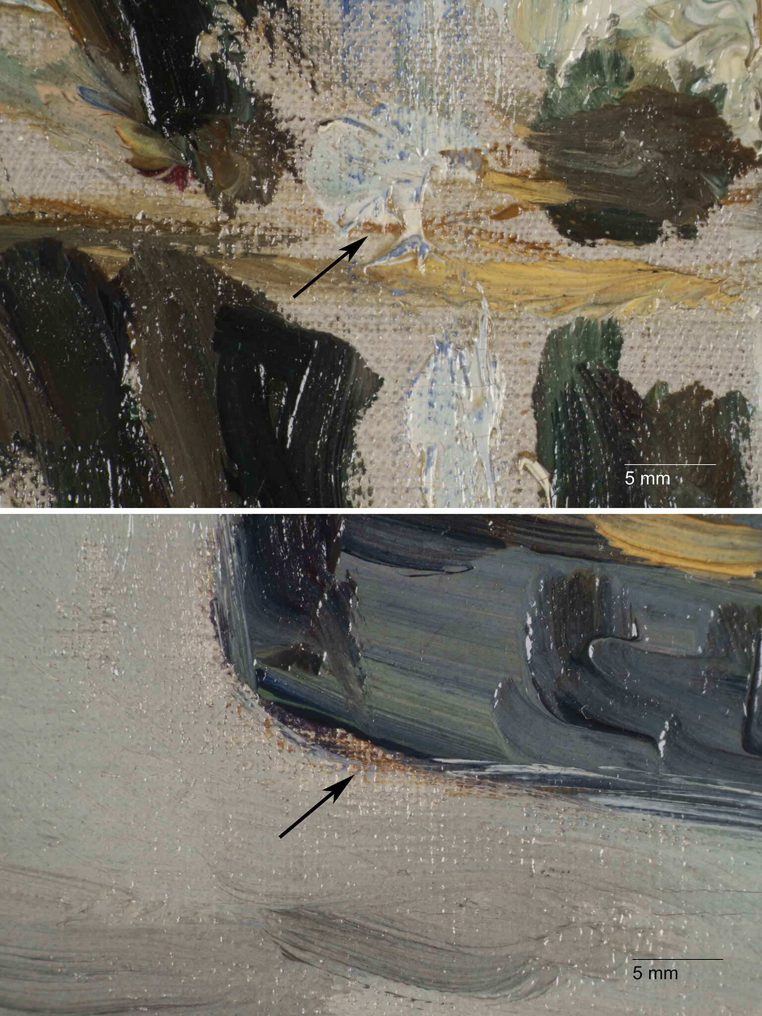 Fig. 11. Photomicrographs of underpainting found in White Lilacs in a Crystal Vase (ca. 1882), with the top image being the upper lip of the vase and the bottom image being the lower edge of the vase. Black arrows point to the brown outlines.