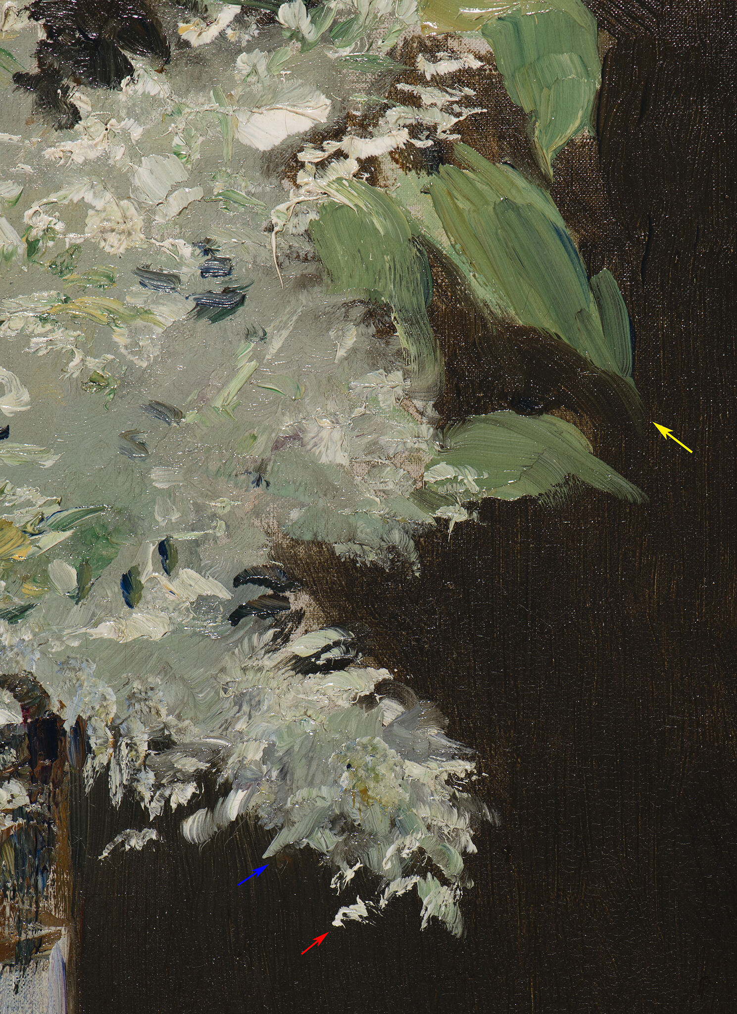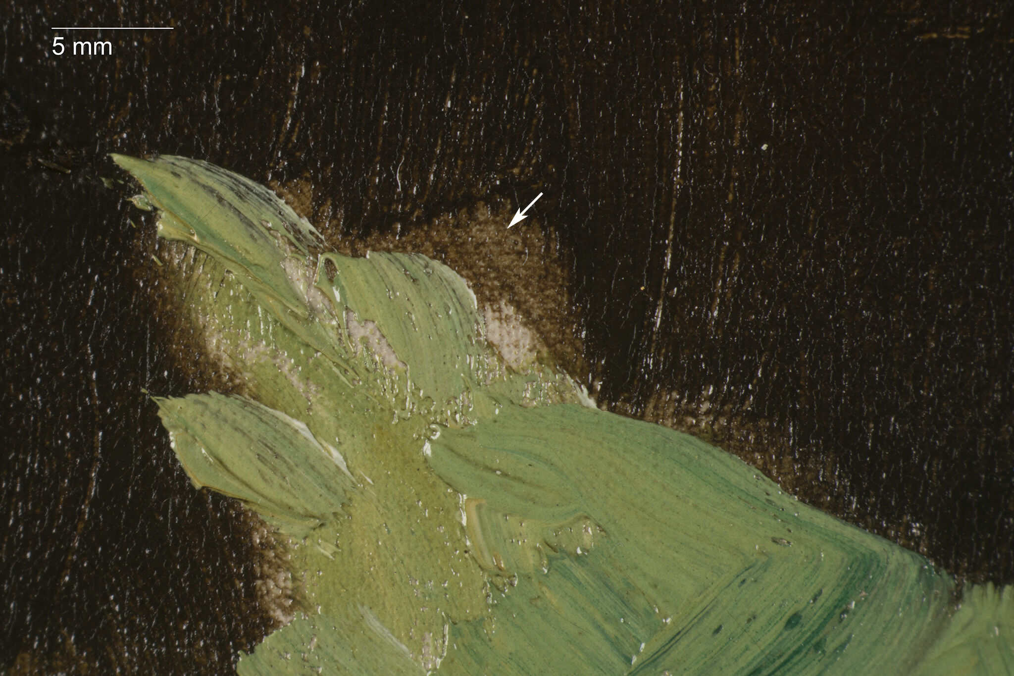 Fig. 13. Photomicrograph within the leaves of White Lilacs in a Crystal Vase (ca. 1882). In the center of this image, a white arrow points to the cooler light green paint, which may relate to the original placement of the leaves.