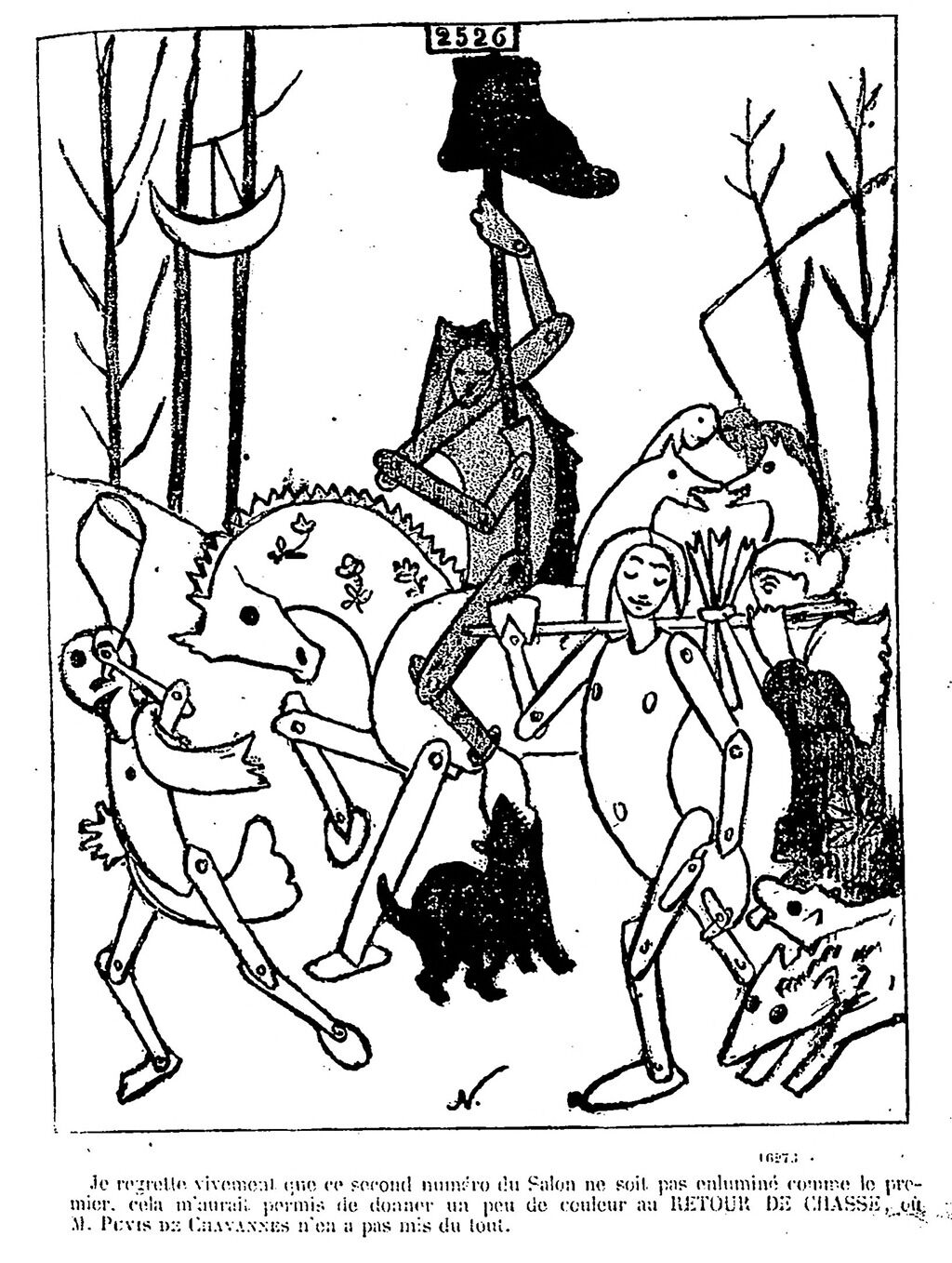 The caption of this caricature reads: “Je regrette vivement que ce second numéro du Salon ne soit pas enluminé comme le premier cela m’aurait permis de donner un peu de couleur au RETOUR DE CHASSE, où M. Puvis de Chavannes n’en a pas mis du tout” (I deeply regret that this second issue of the Salon is not illuminated like the first, which would have allowed me to add a little color to THE RETURN FROM THE HUNT, where Mr. Puvis de Chavannes did not add any at all). My thanks for the superb documentation files at the Nelson-Atkins Museum of Art for these references and to the staff there for bringing them to my attention.