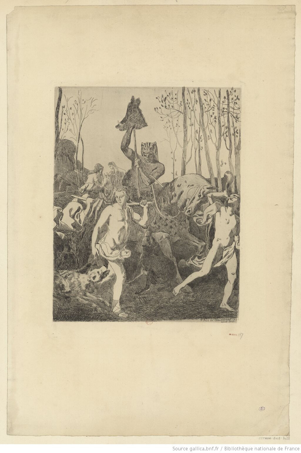 Pierre Puvis de Chavannes, Return from the Hunt, 1862, etching in black on laid paper, second and last state, 12 1/2 x 9 1/2 in. (31.7 x 24.2 cm), Bibliothèque nationale de France, Paris, Département des Estampes et de la Photographie, DC-303B-FOL.