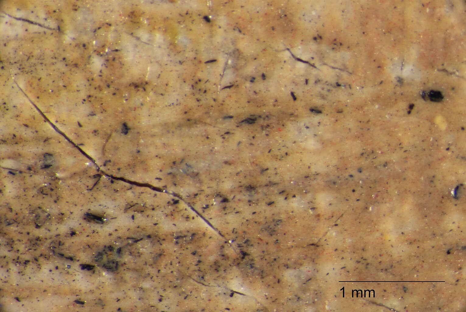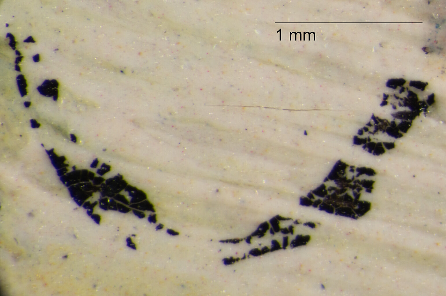 Fig. 6. Photomicrograph of the vase, Still Life with Guelder Roses (1892), revealing charcoal particles dispersed by an overlying stroke of fluid orange paint